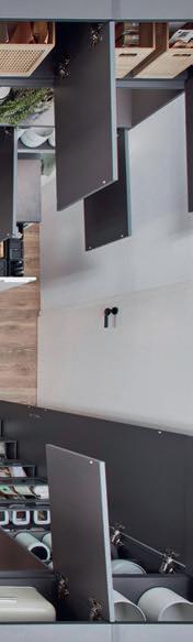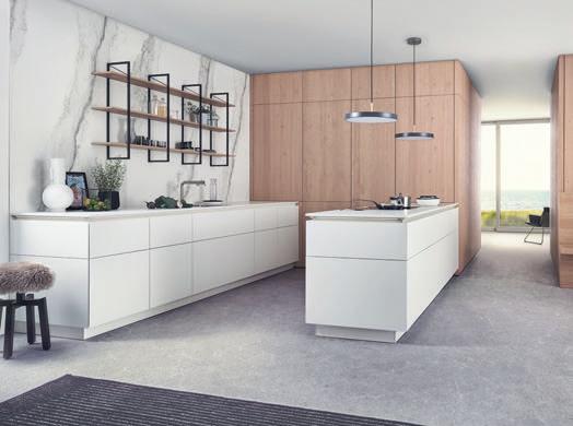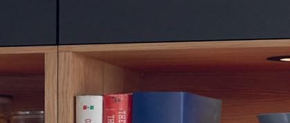 Les étagères offrent des espaces de rangement ouverts créant, grâce à leur symétrie, une structure visuelle claire dans la pièce. Sous le plan de travail toutefois, les éléments sont fermés. Pour changer des éléments hauts classiques, les murs se garnissent d'étagères suspendues, munies d'élégantes portes vitrées Vero.