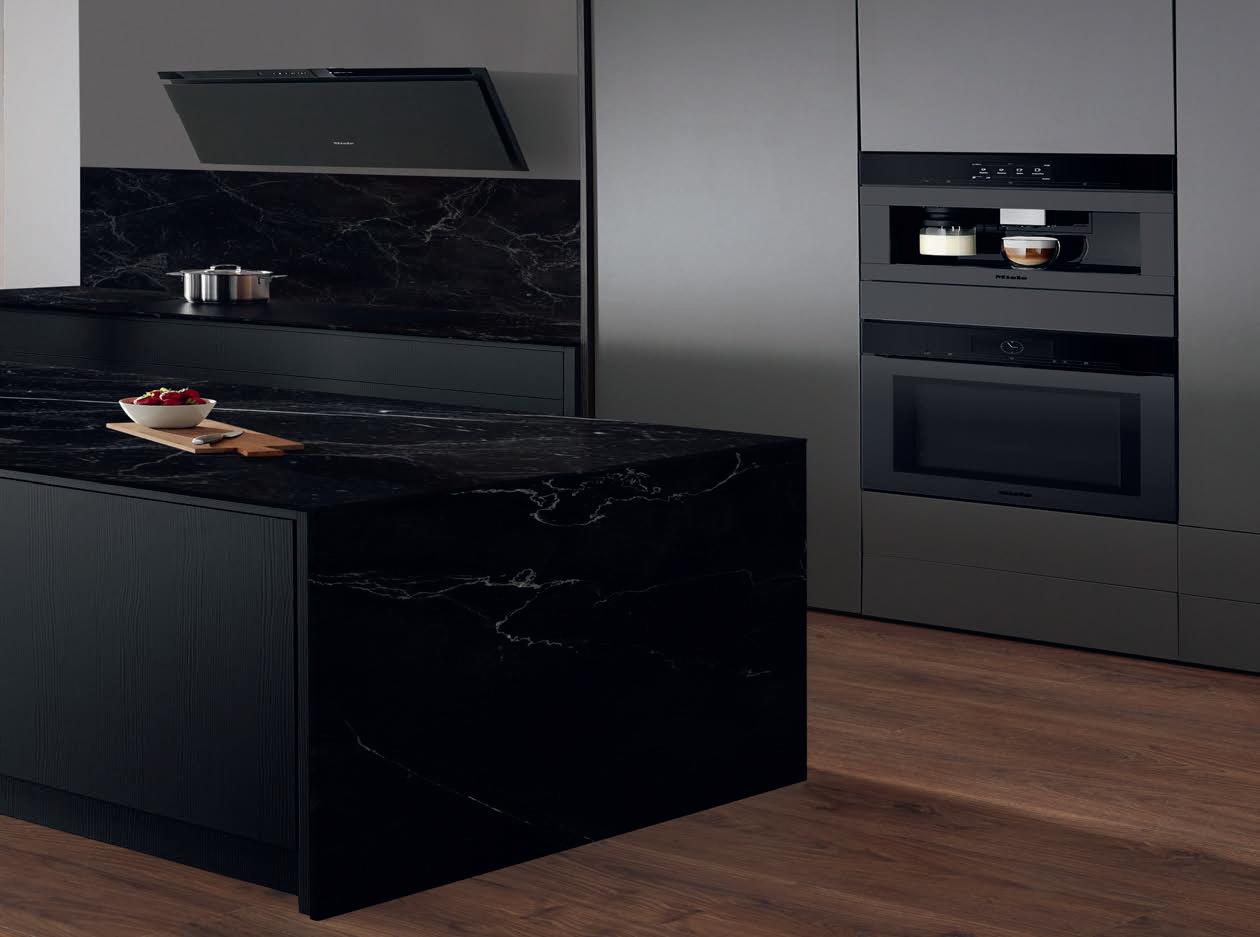 Le choix du noir et du blanc pour une cuisine d'une élégance intemporelle. Pour donner une impression de légèreté à l'imposant îlot monolithique, un ruban blanc parcourt tous ses côtés, mettant en scène de manière saisissante la plaque de cuisson et l'évier. À noter aussi les façades en laque mate de qualité supérieure, garantie anti-traces de doigts.