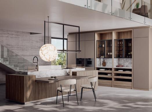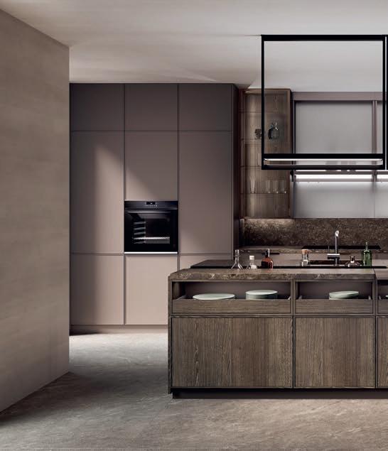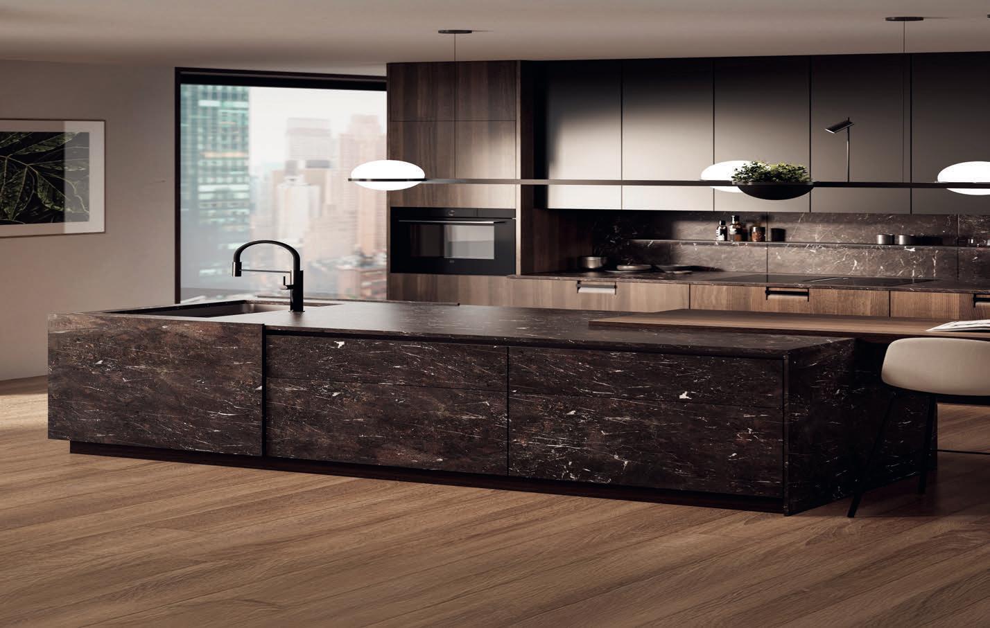 Le modèle SCUOL offre un cadre raffiné où il fait bon se détendre en fin de journée. Sa teinte sombre couleur café torréfié ne manque pas d'élégance, diffusant une agréable chaleur. L'esthétique est épurée et rectiligne. Le tout se veut généreux, avec un vaste espace pour cuisiner. Deux îlots centraux reliés par une table haute forment le cœur de cette cuisine ouverte et accueillante, conçue pour les échanges et les moments partagés.