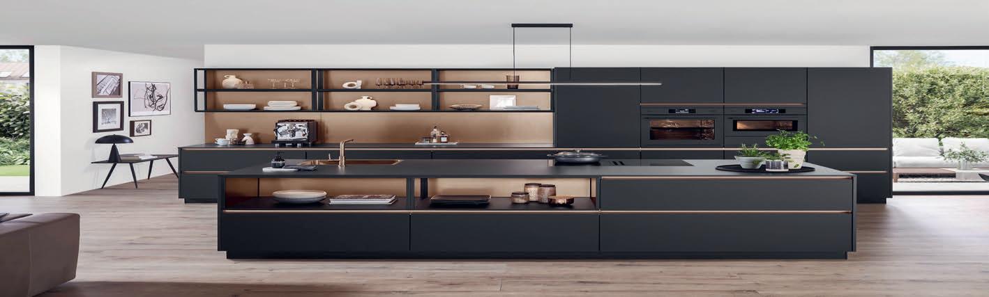 Le noir mat est associé à des détails de couleur bronze pour un look résolument moderne. À noter l'effet réussi des reflets métalliques que renvoient la niche et les étagères Smartcube de l'îlot central, dont les panneaux arrière sont eux aussi de couleur bronze. Avec le plan de travail et la niche aspect chêne, l'ensemble offre un tableau bien équilibré entre teintes naturelles et profondeur des matériaux.