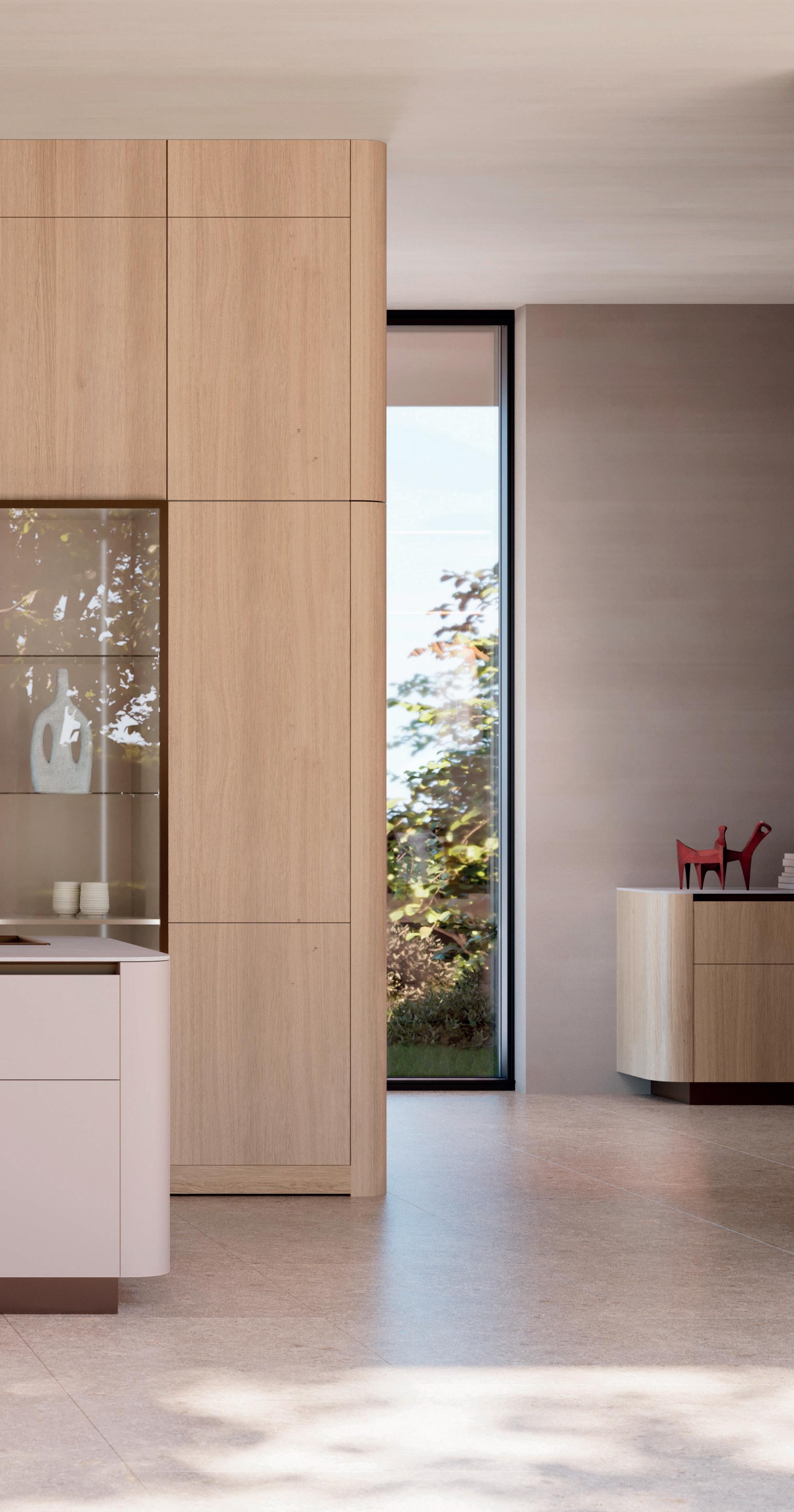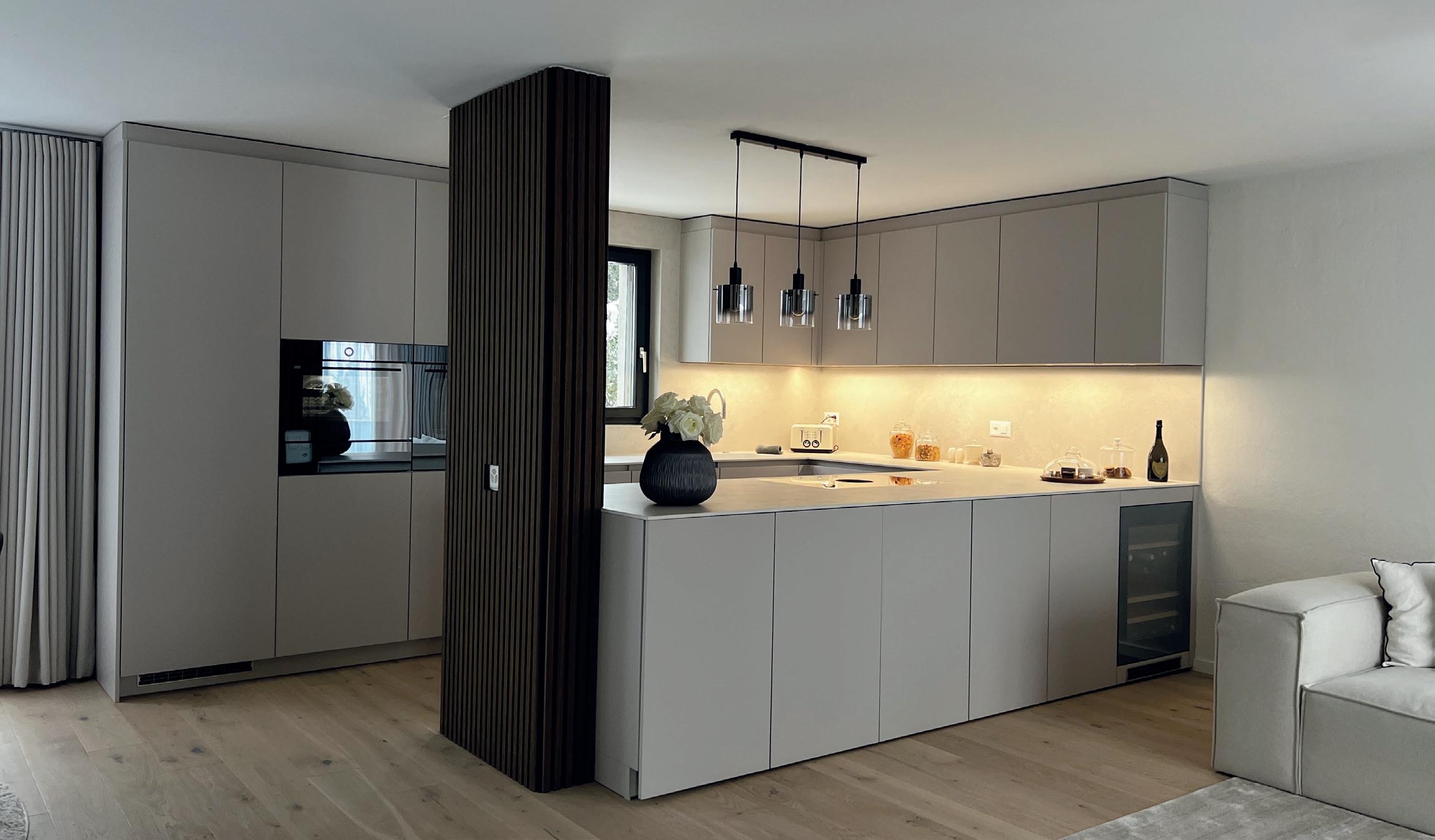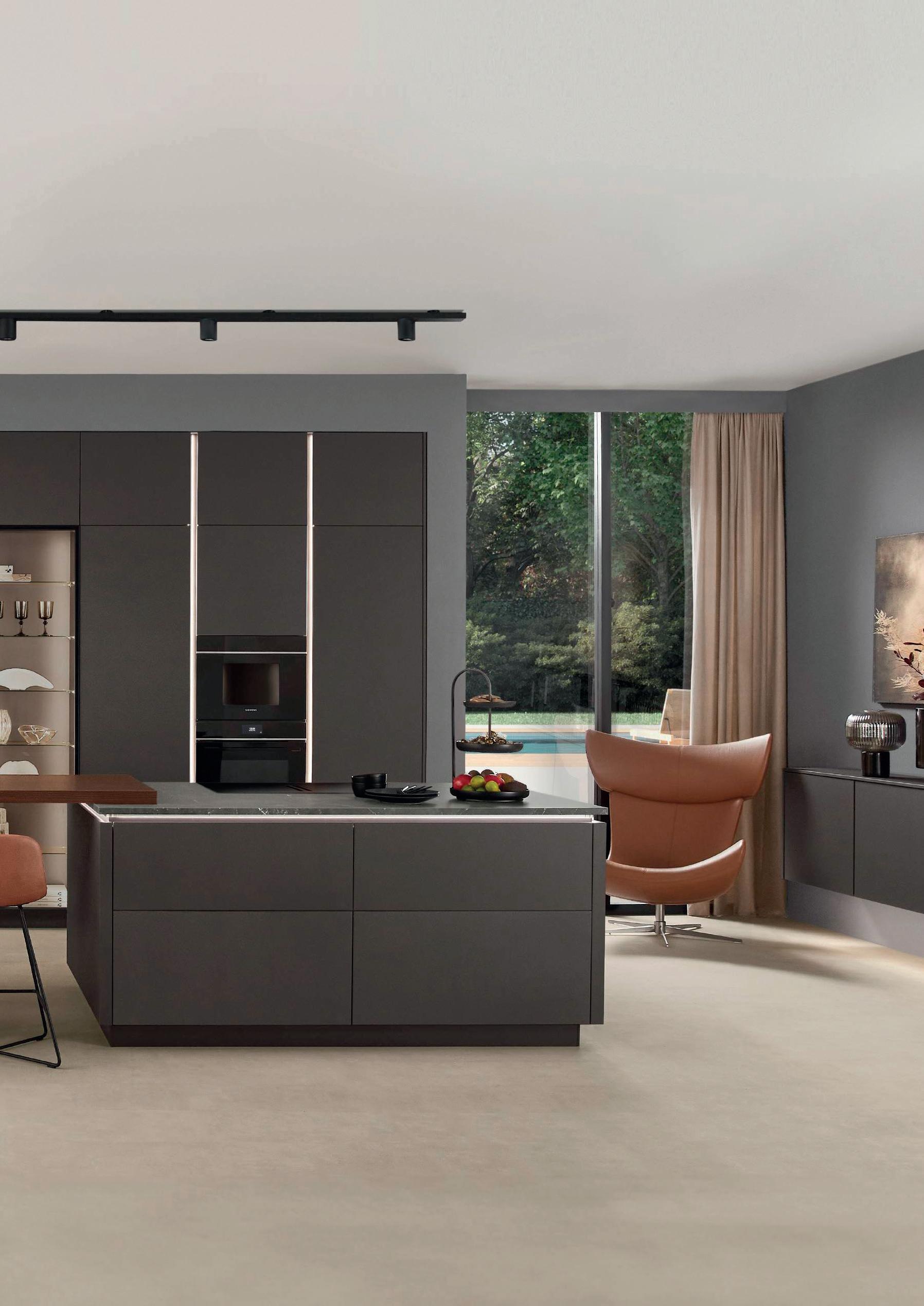 Cette cuisine allie élégance et convivialité. Parfaits pour cuisiner, mais aussi pour échanger et partager des moments ensemble, les deux îlots reliés par une table haute constitue la pièce maîtresse. Les poignées intégrées avec éclairage vertical créent une ambiance raffinée, tandis que les éléments vitrés Air, dotés de charnières invisibles, soulignent la sobriété du design – une signature élégante pour une cuisine moderne.