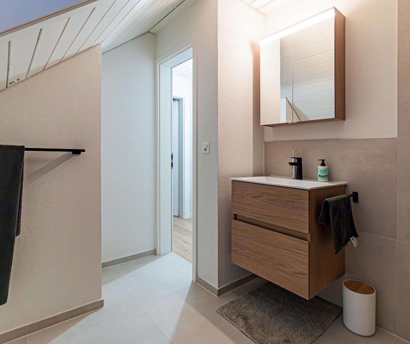 L’ancienne salle de bains avec ses deux lavabos manquait avant tout d’espaces de rangement. Aujourd’hui, le carrelage beige moderne, la double vasque posée sur un meuble en bois élégant et les solutions de rangement bien pensées apportent plus de confort. La douche a été remplacée par une baignoire qui invite à la détente.