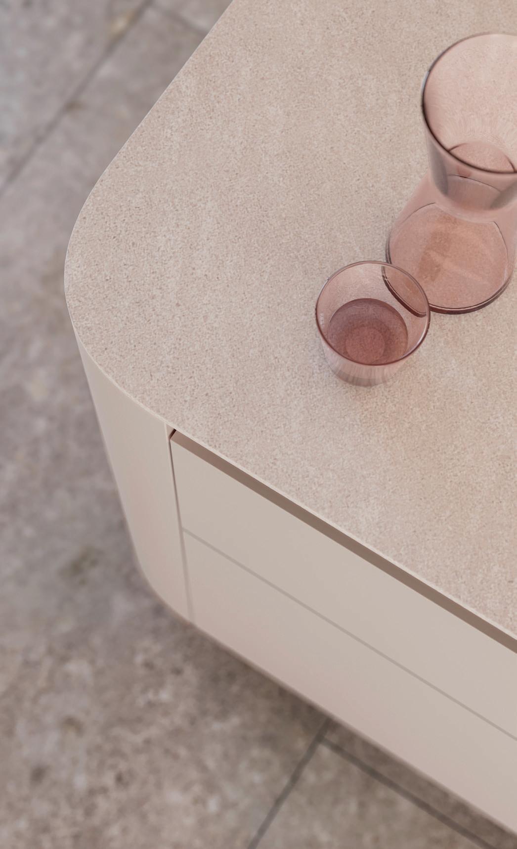 La cuisine affiche une silhouette d’une belle cohérence grâce à ses angles délicatement arrondis et ses plans de travail tout en courbes douces. Les transitions fluides créent une atmosphère chaleureuse et accueillante, où cuisine et espace de vie dialoguent harmonieusement. Arrondis généreux, finitions à l’aspect naturel et détails soigneusement coordonnés viennent souligner le caractère sculptural et l’élégance intemporelle du design.