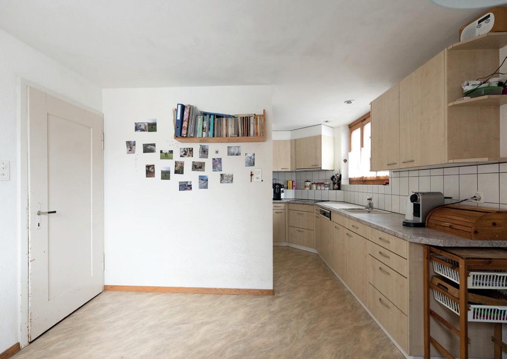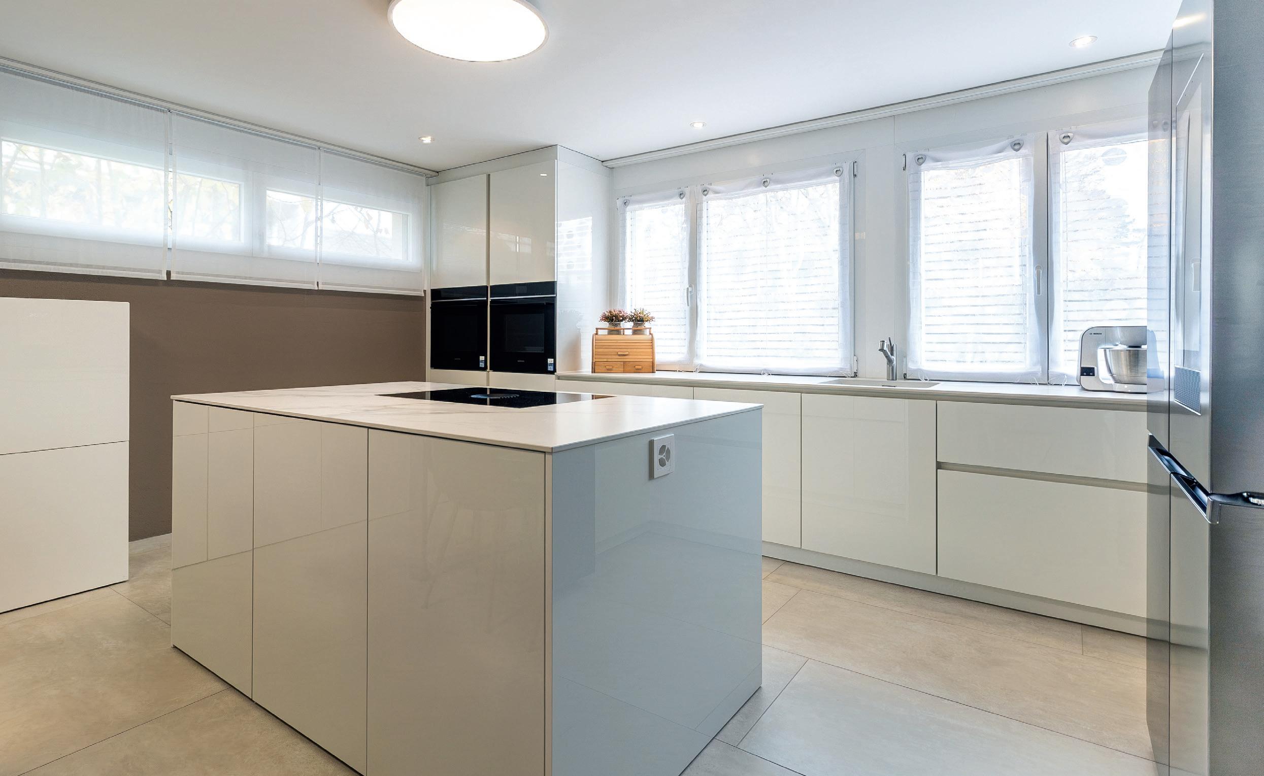 L’ancienne cuisine était dominée par la grande hotte aspirante, qui occupait le champ de vision. Particulièrement lumineuse, la nouvelle cuisine séduit par ses nombreux rangements, sa table de cuisson avec hotte intégrée et son sol clair. Ouverte et moderne, elle est idéale pour cuisiner et se retrouver.