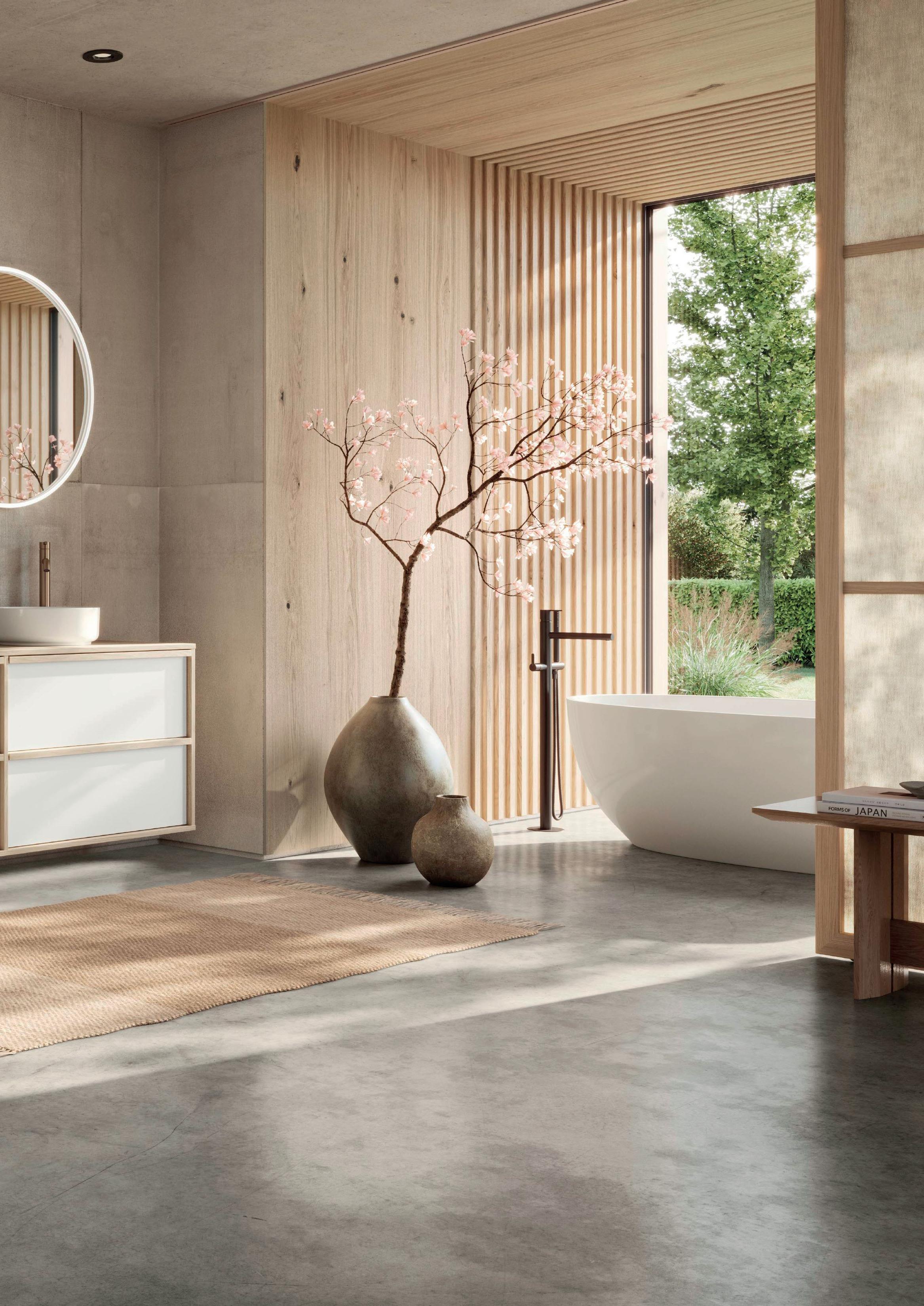 Couleurs naturelles, tons bois chaleureux et matériaux de qualité créent une salle de bains à la fois revitalisante et apaisante. Les façades en retrait et les poignées en bois massif confèrent aux meubles un cachet stylé, tandis que l’association blanc et chêne Como apporte une élégance naturelle. Les tons bronze de la robinetterie et des accessoires ajoutent une touche raffinée tandis que les lignes épurées du style Japandi font de cette salle de bains un espace propice au bien-être.