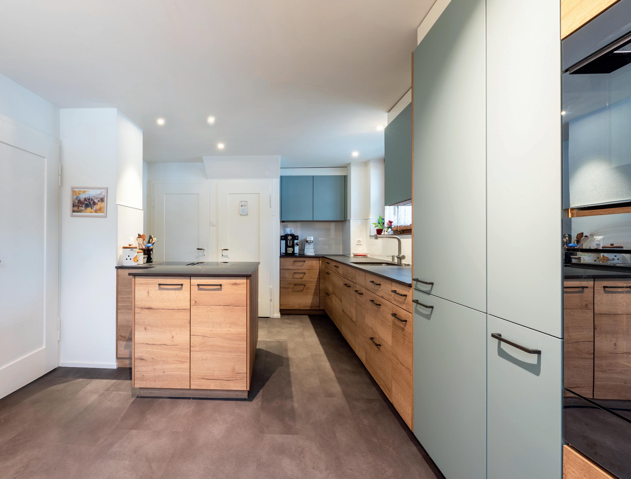 Avec son sol en vinyle usé et ses appareils datés, l’ancienne cuisine paraissait fermée et sombre. La nouvelle cuisine associe façades en bois noble et façades vert clair. Le mur partiellement ouvert apporte plus de visibilité. L’îlot, doté d’une zone de cuisson, offre des rangements supplémentaires. Les nouveaux appareils électriques, moins énergivores et le nouveau sol complètent parfaitement l’ensemble.