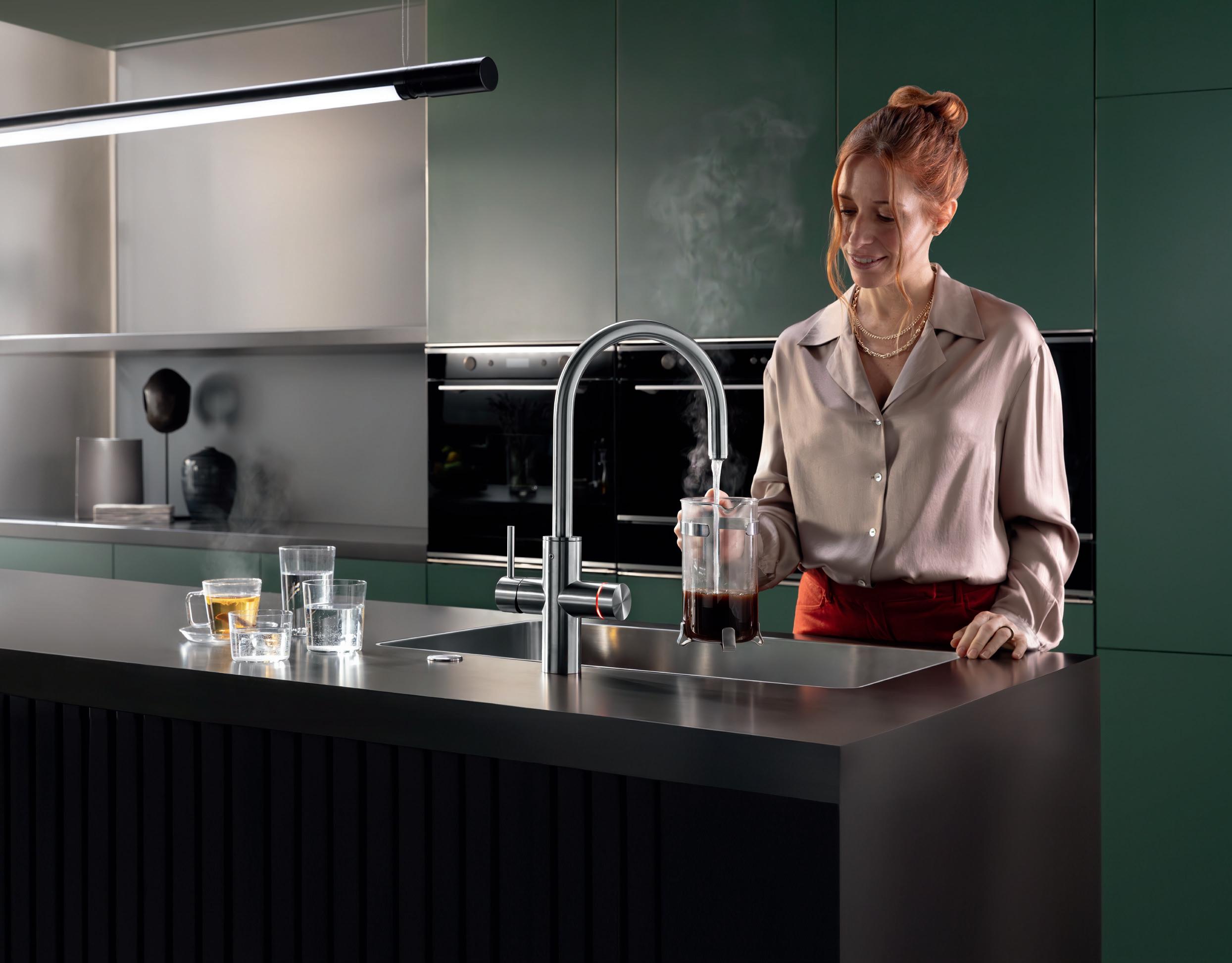 Découvrez le nouveau Mythos Water Hub, un robinet multifonction 6 en 1. Il vous permet de choisir facilement entre eau froide ou chaude, ainsi qu’entre quatre types d’eau filtrée: eau bouillante instantanée, eau réfrigérée, eau à température ambiante et eau pétillante. «Water your Way» – une simple pression sur un bouton suffit.