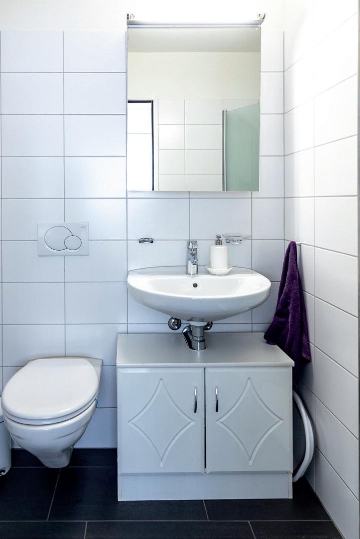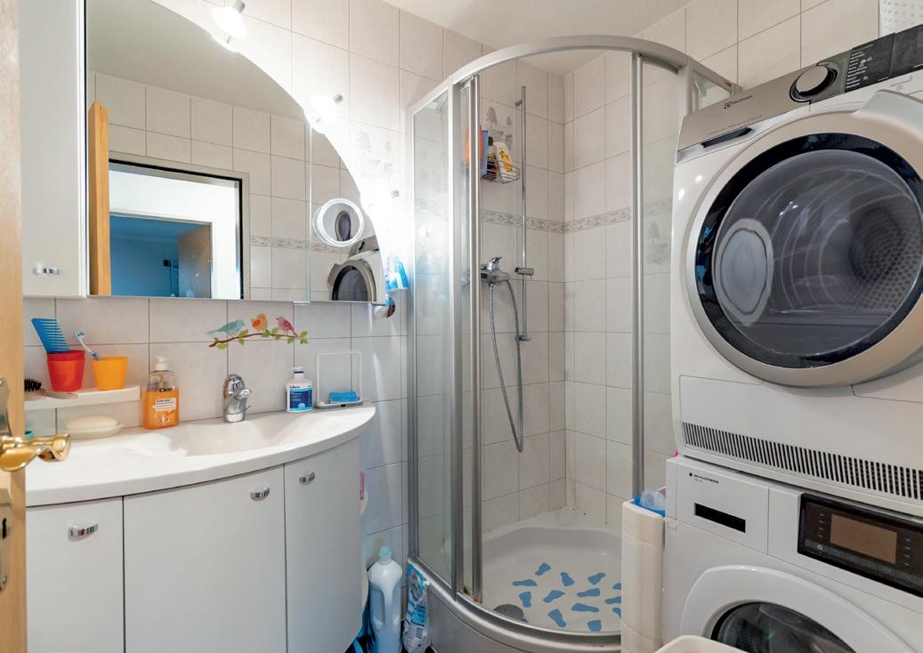 Il vecchio bagno sembrava poco accogliente e stipato di oggetti. Il nuovo bagno rende la stanza più ariosa: moderne piastrelle grigie, mobili nuovi e una doccia a filo pavimento creano un ambiente luminoso, accogliente e moderno.