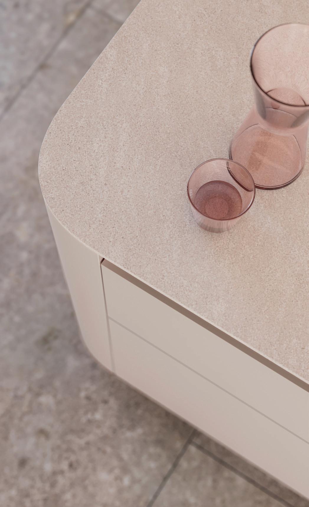 Profili arrotondati e piani di lavoro curvi conferiscono alla cucina una forma fluida e armoniosa. L’assenza di spigoli netti crea un ambiente accogliente e confortevole, il perfetto connubio tra cucina e salotto. Gli ampi spazi, le superfici naturali e i dettagli sapientemente coordinati esaltano il carattere scultoreo e l’eleganza senza tempo del design.
