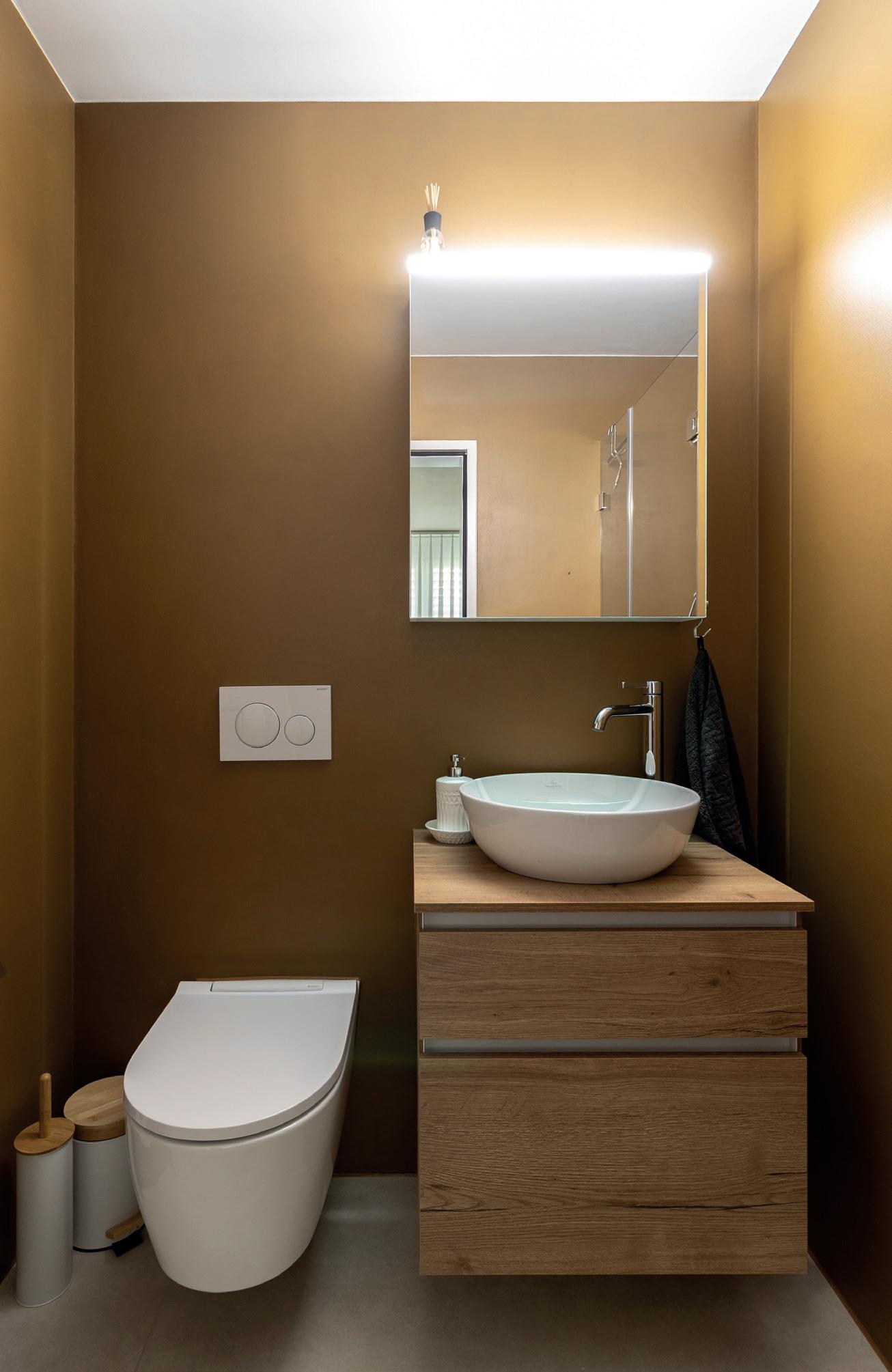 Le vecchie piastrelle bianche davano un’impressione fredda e poco accogliente. Il nuovo bagno convince con mobili e sanitari moderni, mentre le pareti color senape si ergono a vero punto forte dell’ambiente, creando un’atmosfera calda e invitante.