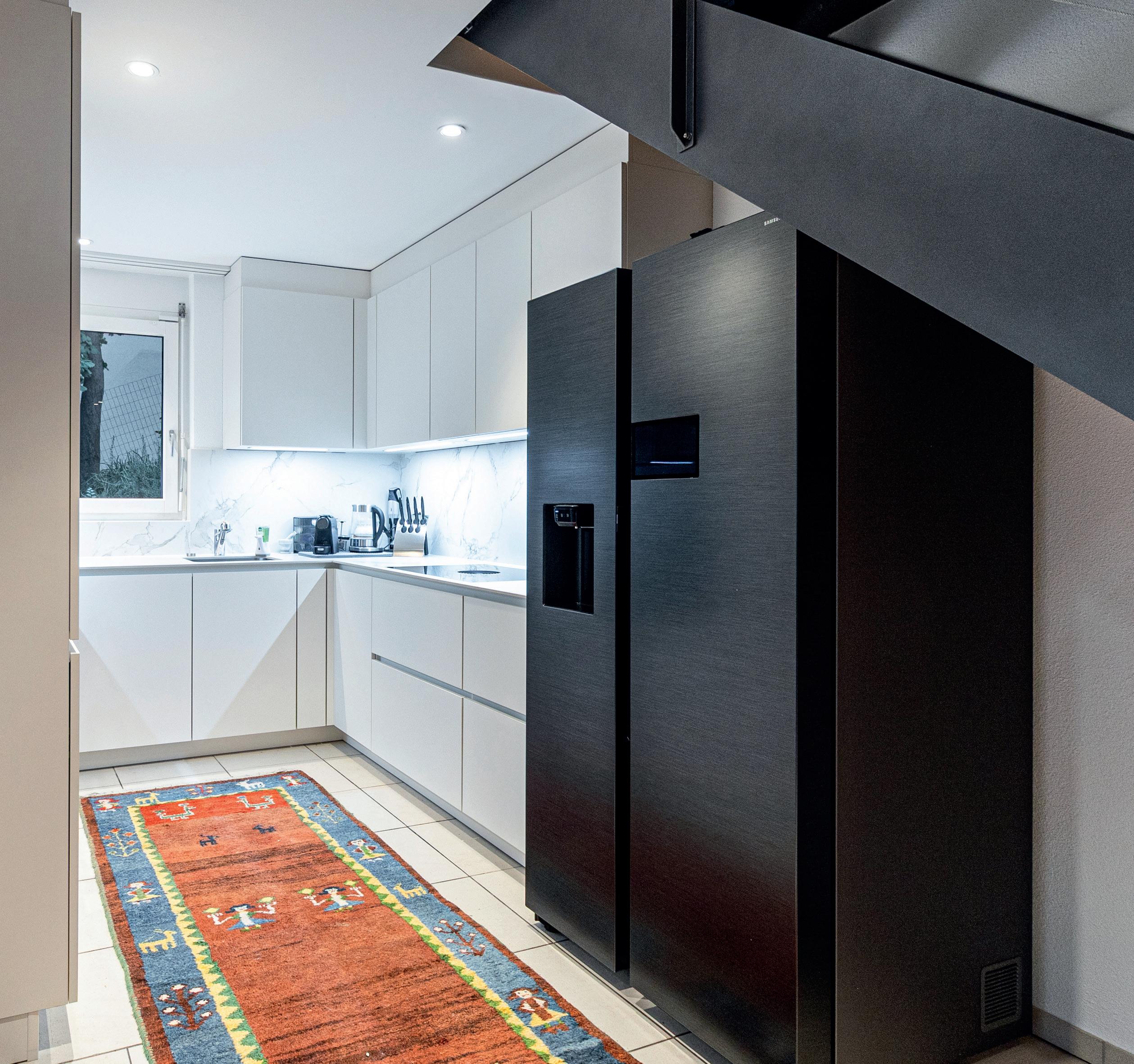 Prima della ristrutturazione, la cucina in legno appariva piccola e poco funzionale. La nuova, luminosa cucina sfrutta al meglio lo spazio del sottoscala, offre ampie superfici di lavoro e mobili capienti, mentre il frigorifero side-by-side le conferisce un tocco urbano.