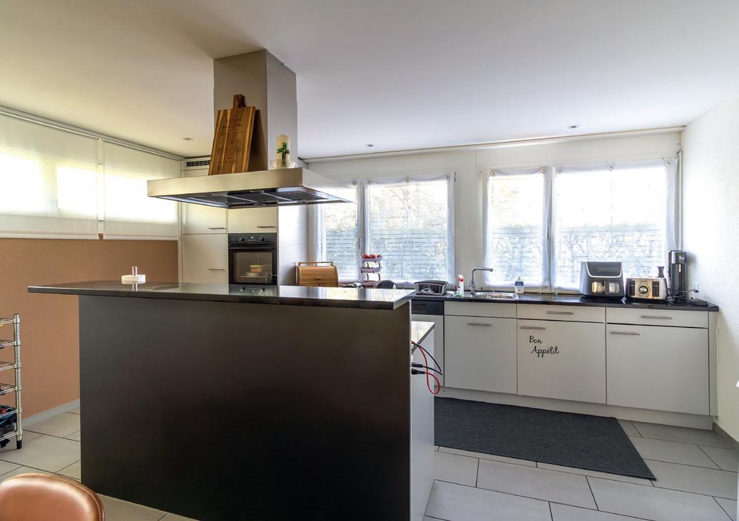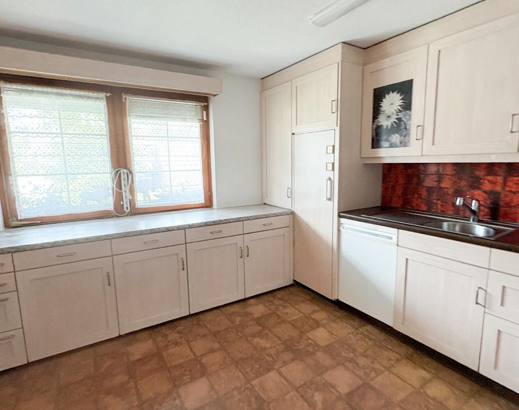 In origine la cucina appariva pesante e poco funzionale, anche a causa della cappa da soffitto in vista. La nuova cucina entusiasma con i suoi toni del bianco e i capienti armadietti, un piano cottura con unità aspirante integrata e un pavimento chiaro. Il risultato è uno spazio arioso, moderno, ideale per cucinare e mettersi a proprio agio.