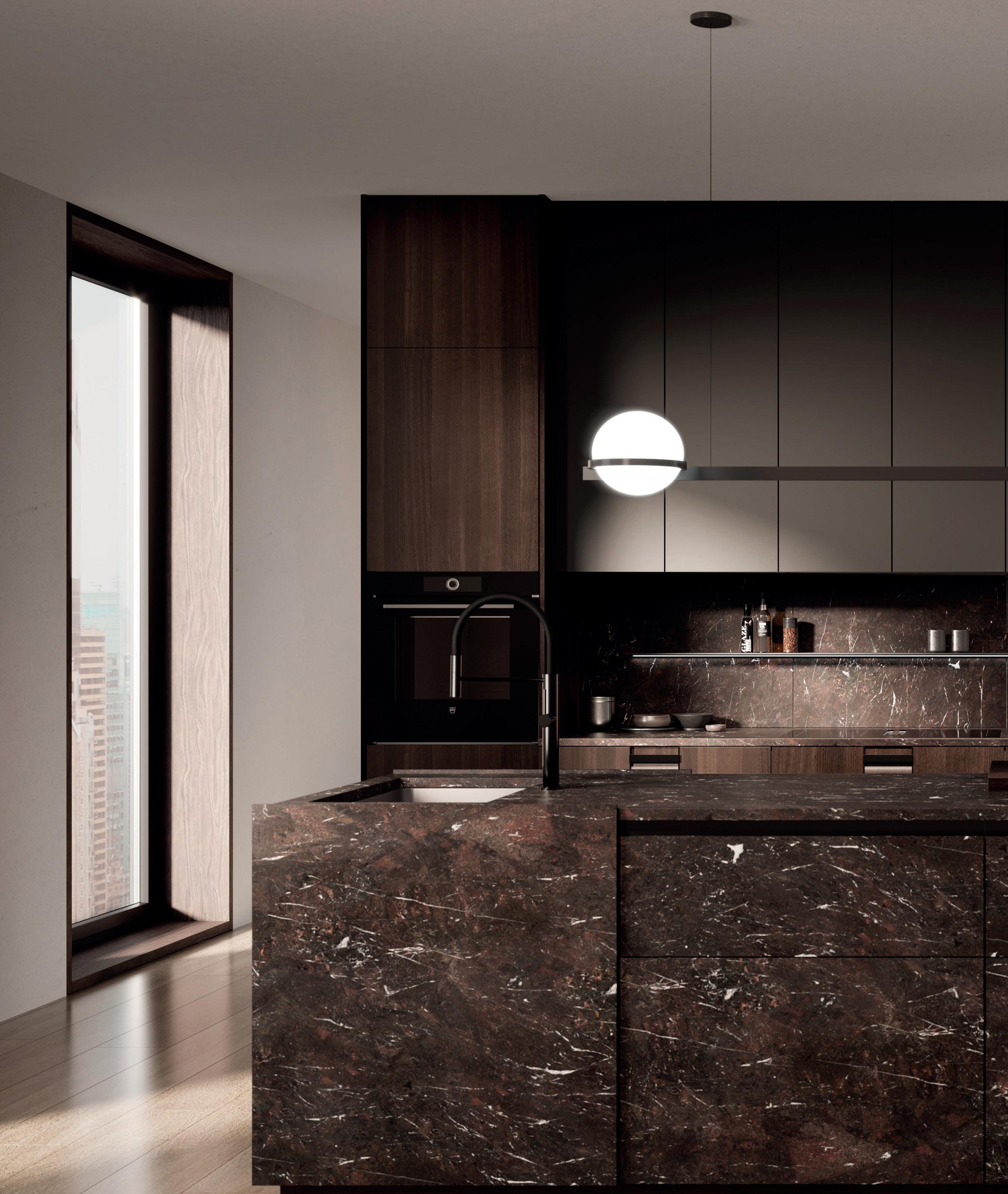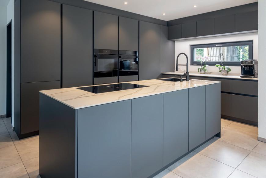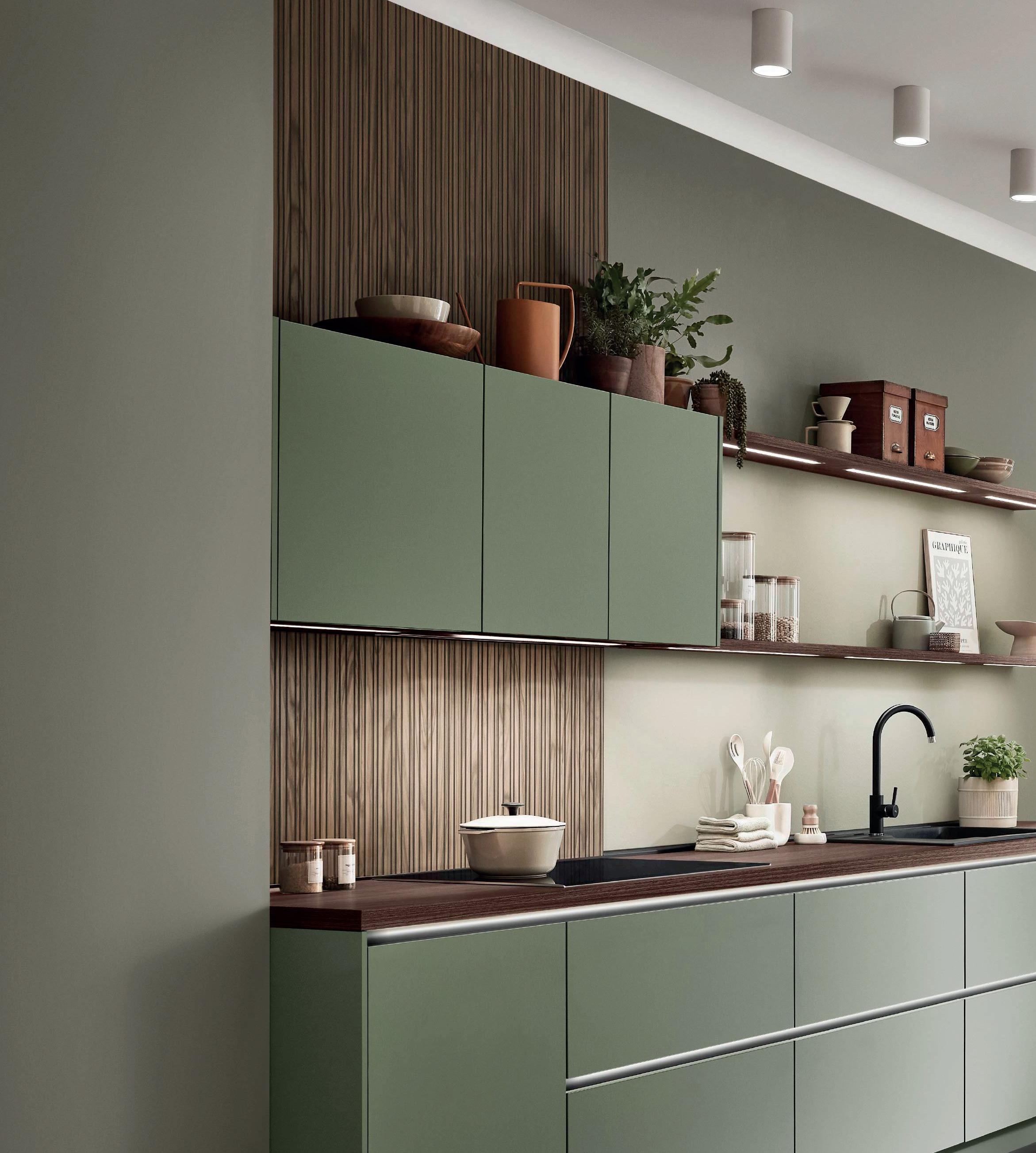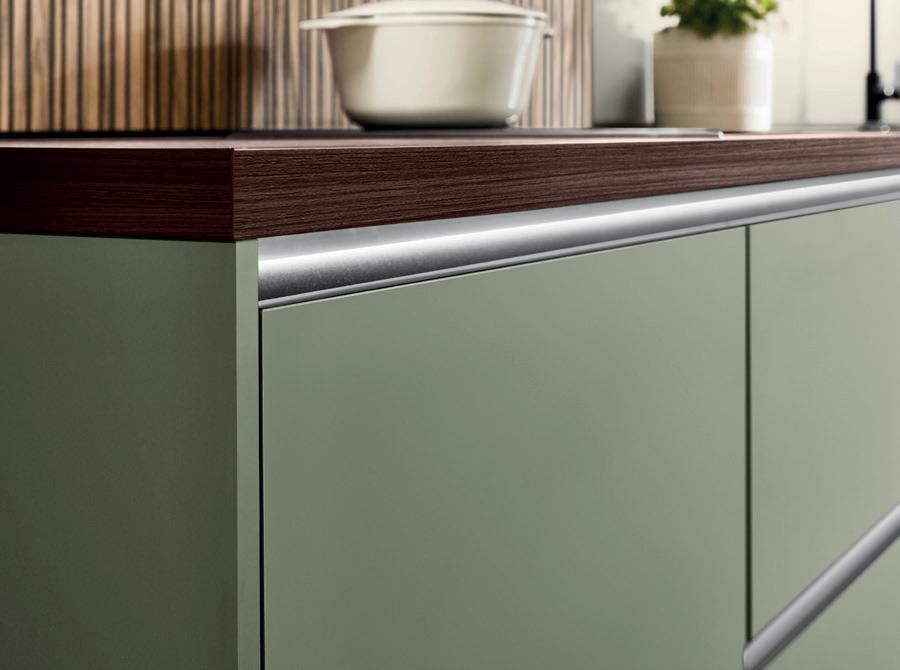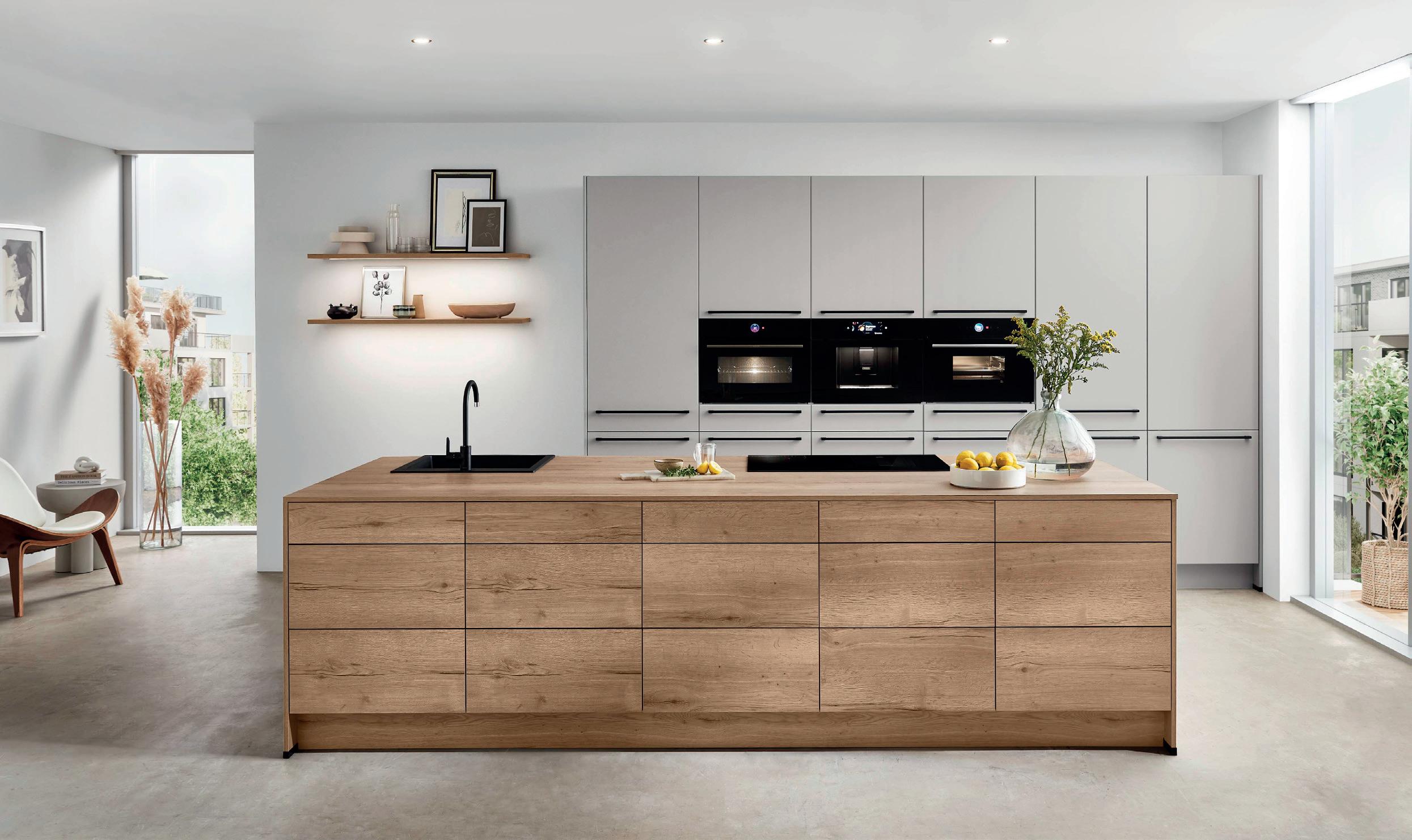 Cuisiner et savourer ensemble – dans une cuisine facile d’entretien avec des surfaces mates, anti-traces de doigts. Inspiré de la nature, le concept ton sur ton harmonieux en olive associé au plan de travail robuste en noyer Milano assure un équilibre parfait entre modernité et convivialité. L’aspect bois authentique de l’habillage de crédence Stripewood dark renforce le côté charmant et chaleureux. On aime y partager des moments précieux avec ses proches!
