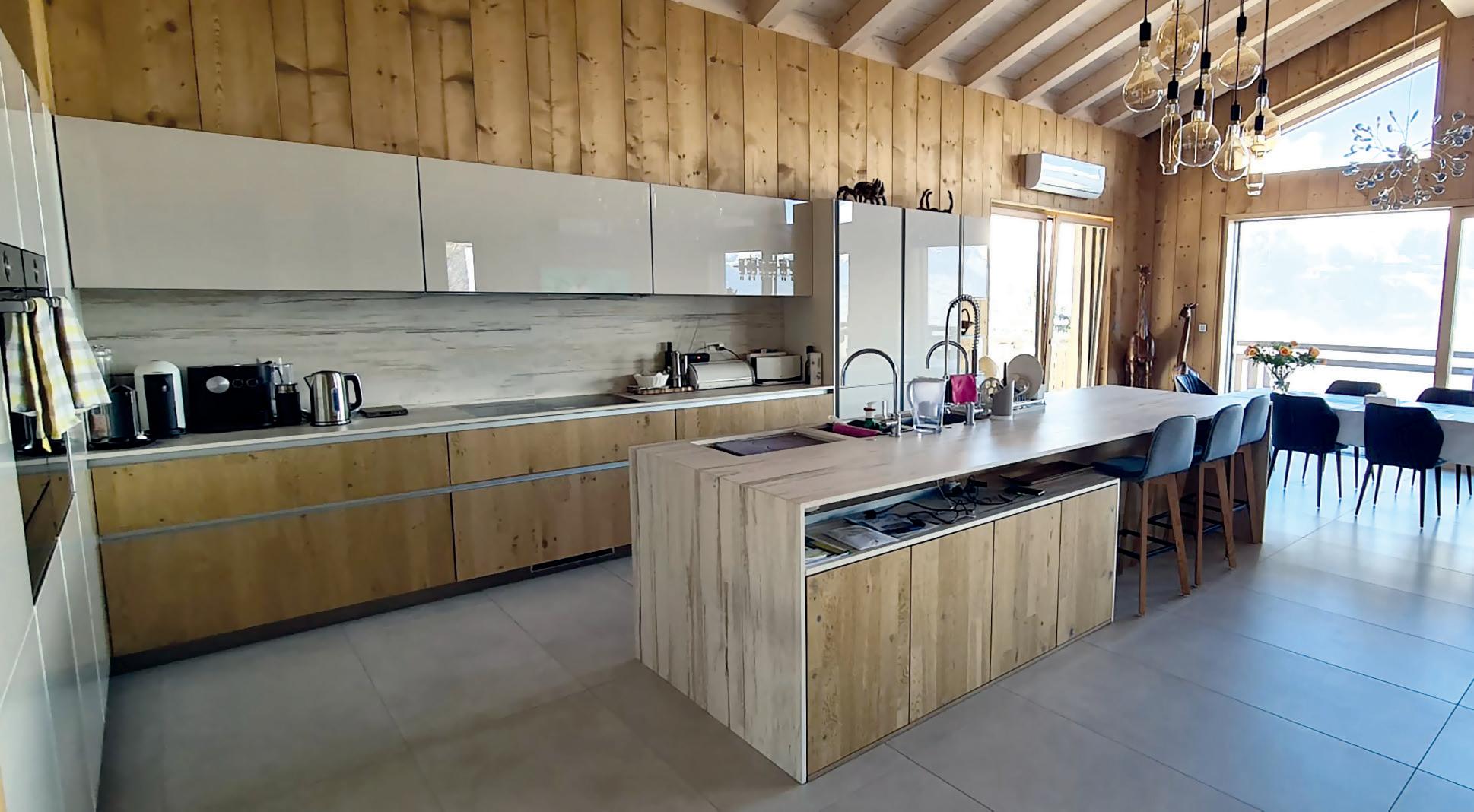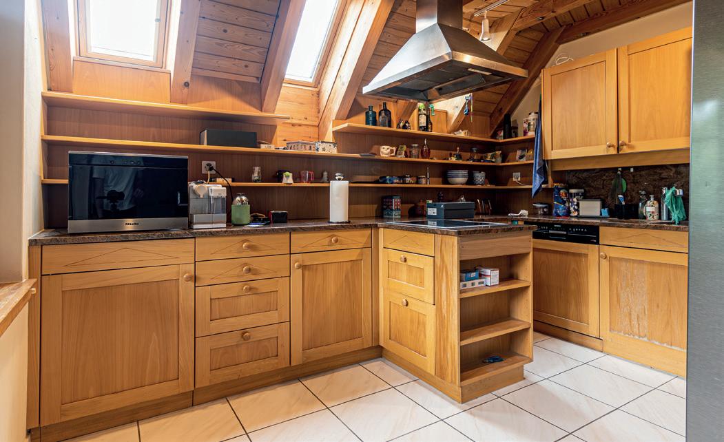 Les meubles en bois des années 1990 ont cédé la place à une cuisine marron moderne avec un vaste espace de rangement. Le sol d’origine a été conservé, tandis que le nouveau design assure un aspect contemporain et plus de fonctionnalité.