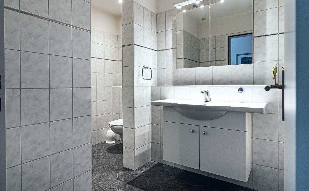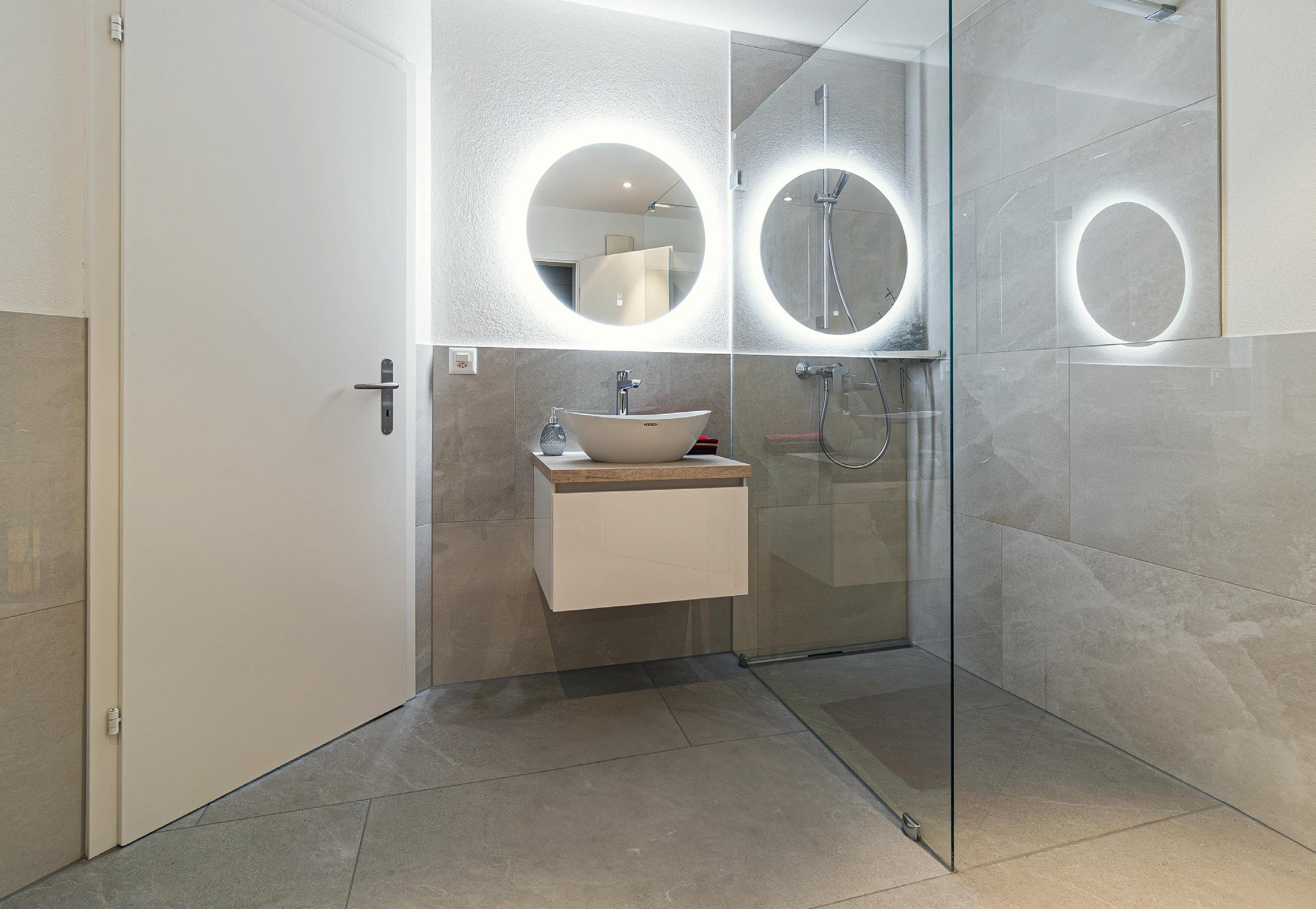 La salle de bains blanche a cédé la place à une oasis de bien-être moderne aux tons harmonieux. Une douche moderne aux détails raffinés et un éclairage de miroir élégant apportent à la pièce une ambiance chaleureuse et contemporaine.