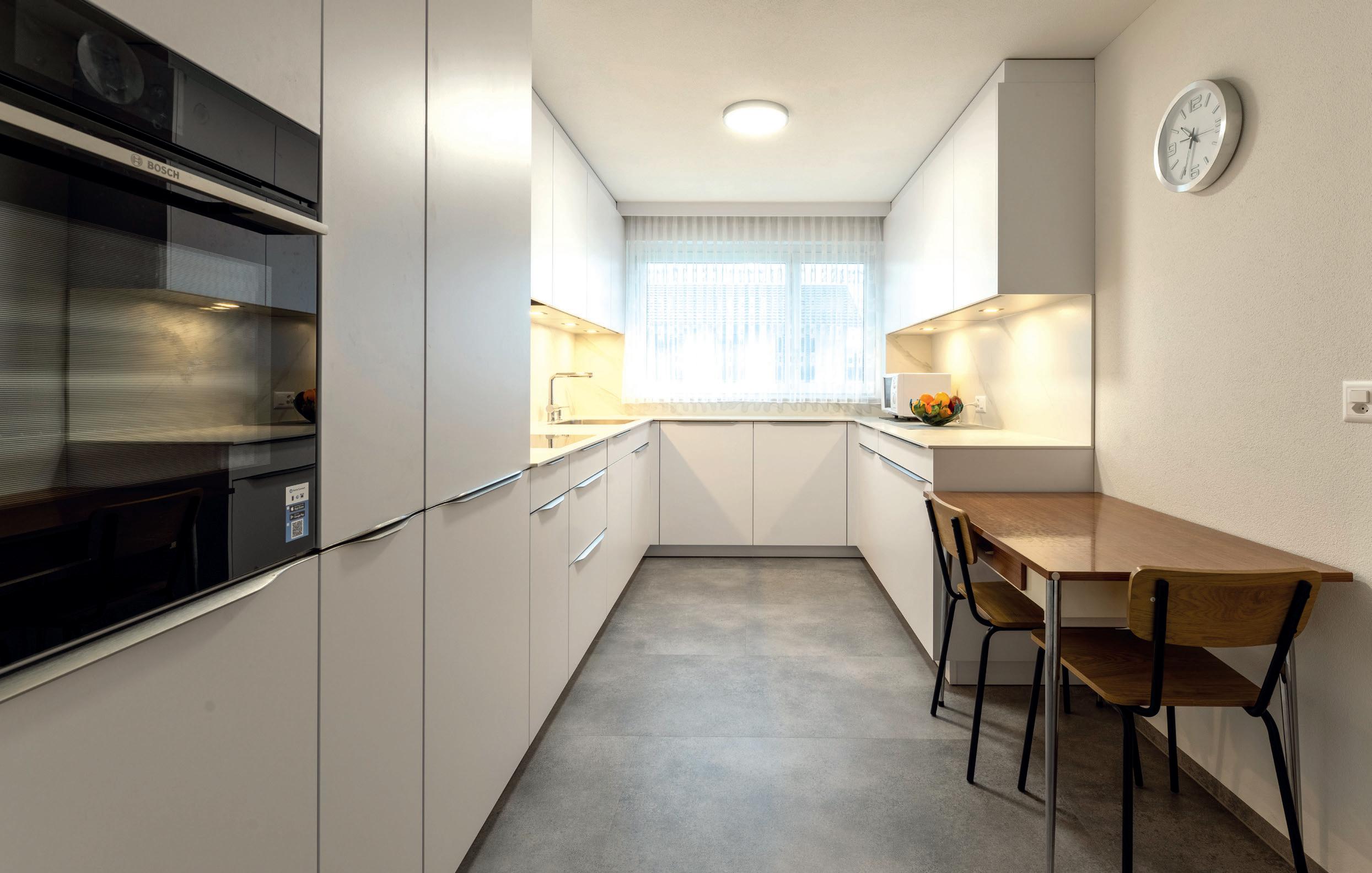 Les meubles foncés et le carrelage ancien ont cédé la place à une cuisine moderne blanche. Le nouveau sol gris confère de l’élégance, tandis que l’éclairage d’ambiance et les équipements de qualité créent une atmosphère accueillante.