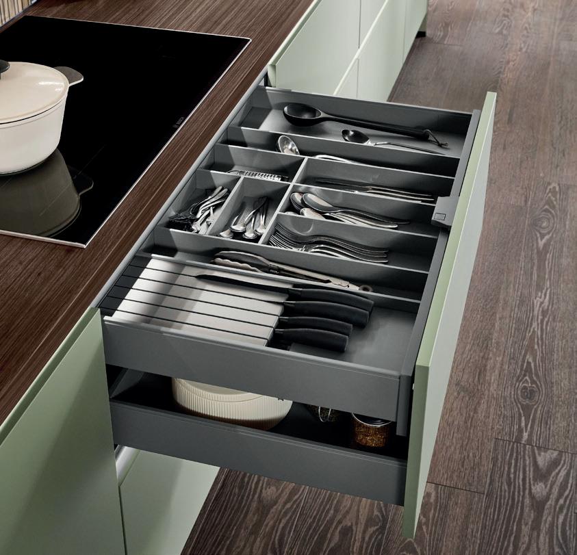 Tiroir filigrane et carré avec un cadre de seulement 10,7 mm d’épaisseur. L’esthétique épurée et minimaliste caractérise l’ensemble de notre système de tiroirs et de caissons intérieurs, tant au niveau des formes que des couleurs.