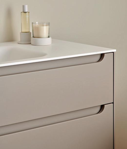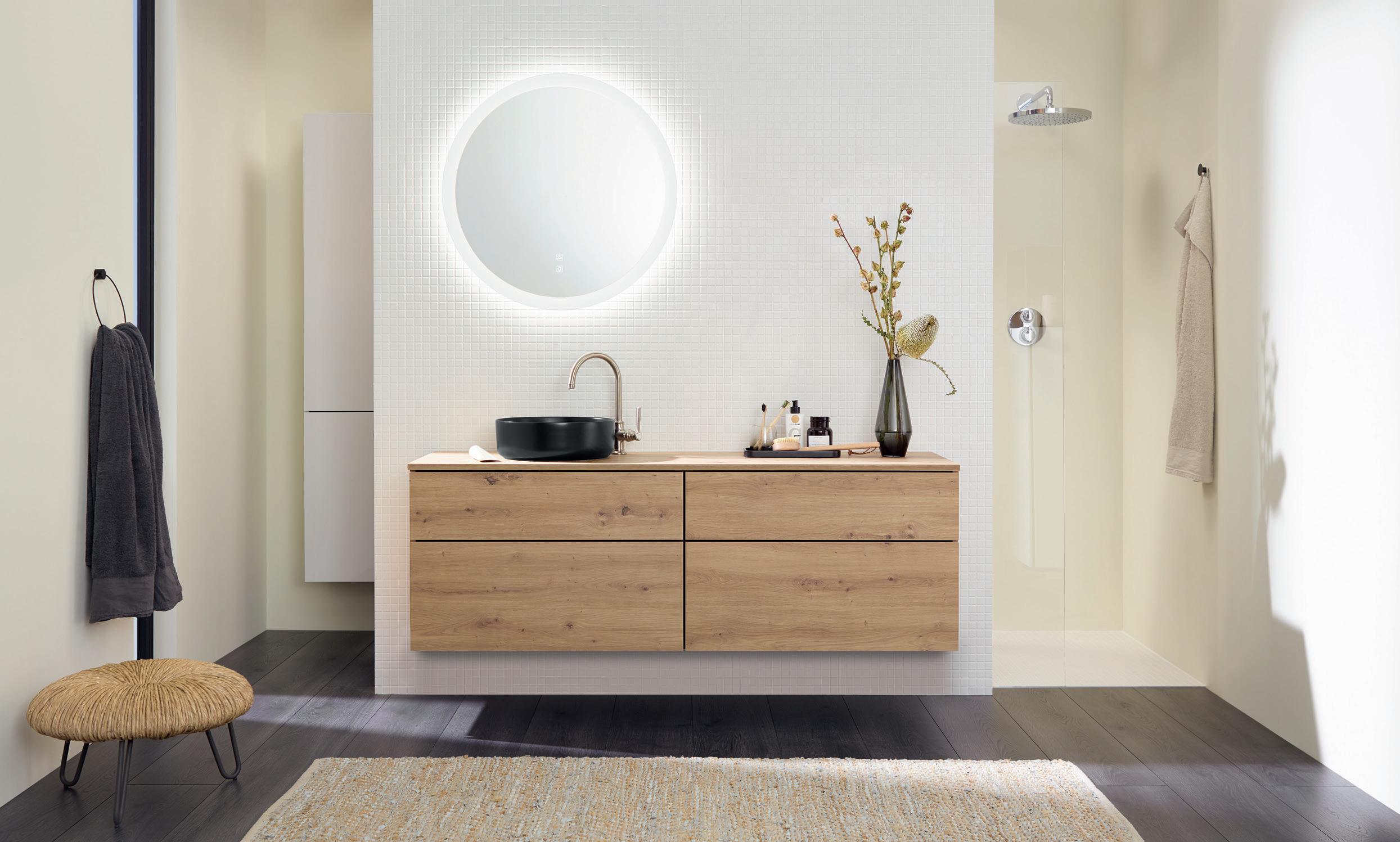 Des coloris modernes, des matériaux faciles d’entretien et des façades mates dans des teintes naturelles sont les principaux éléments de ce concept de couleurs moderne. Le lavabo sans joints fabriqué dans un matériau minéral facile d’entretien est associé à un meuble bas à 2 tiroirs dans un beige tendance.