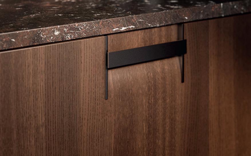 Les éléments élégants en bois foncé associés à l’îlot de cuisine mis en évidence accentuent cet aspect impressionnant. L’association du concept de poignée en Q et de l’environnement moderne de la cuisine crée une ambiance harmonieuse et fonctionnelle.