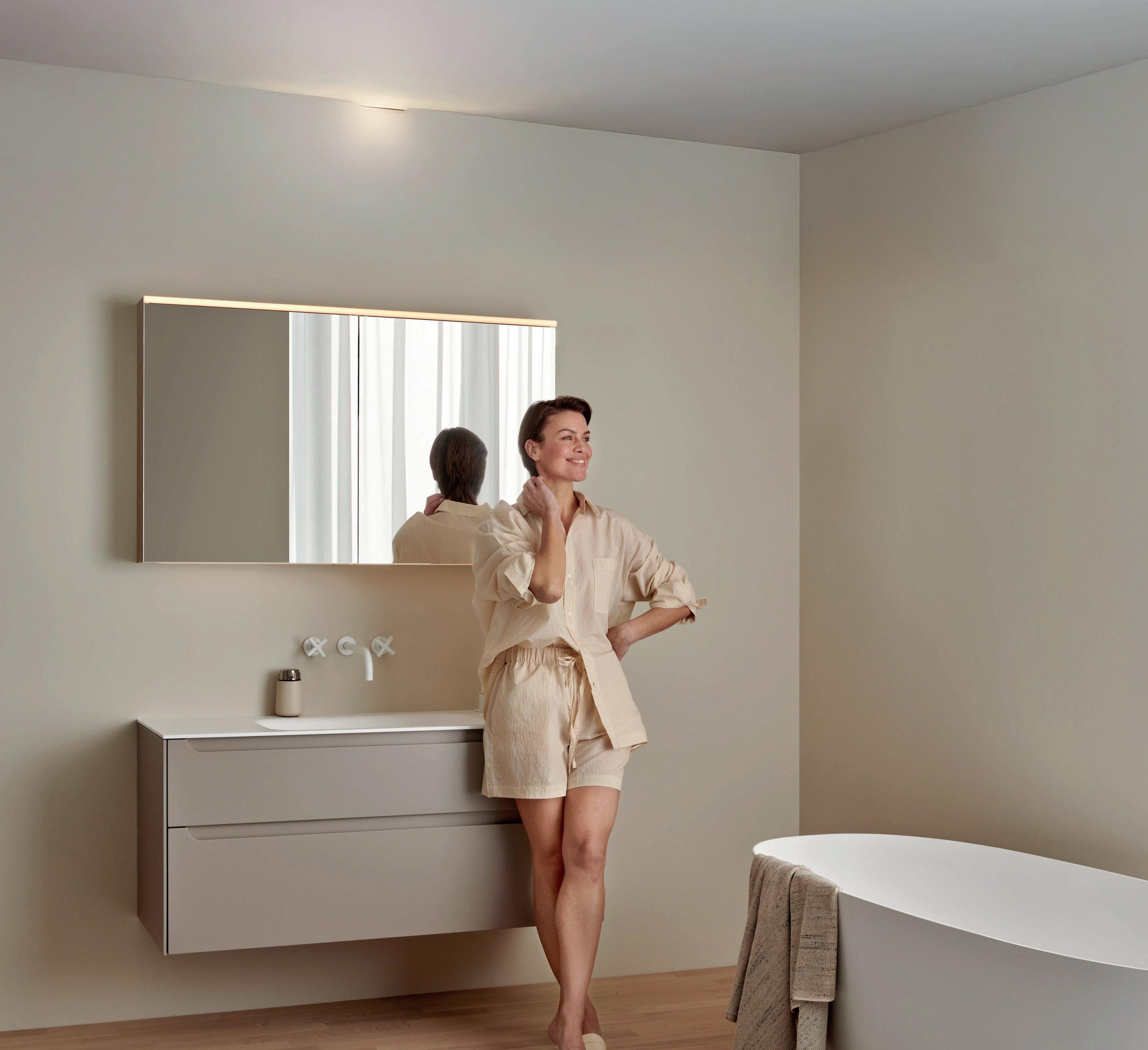 Avec ses surfaces intemporelles et modernes ainsi que ses lignes épurées, la nouvelle série de meubles de salle de bains FAY signée Fust dégage une insouciance raffinée. Le design se caractérise par la continuité des matériaux assurée par la poignée encastrée en retrait.