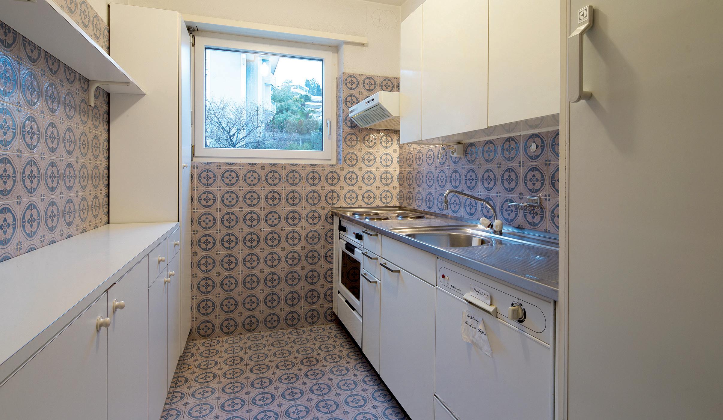 L’ancienne cuisine – des éléments qui grincent, des carreaux colorés et des appareils électriques gourmands en énergie dans un espace réduit.
