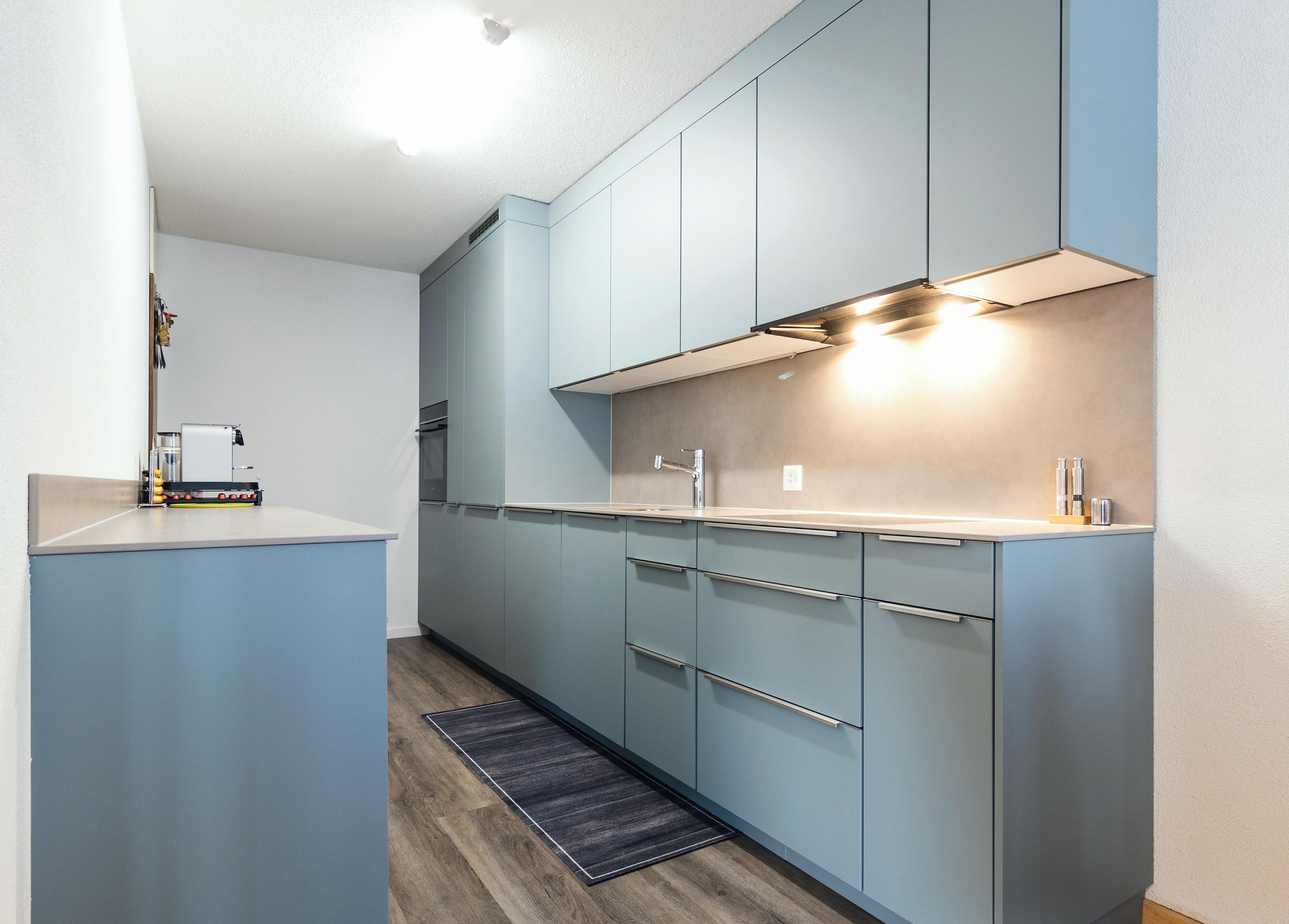 Le gris peu avenant de l’ancienne cuisine a été remplacé par un bleu élégant. Cette nouvelle couleur confère calme et élégance à la pièce, tandis que le design moderne crée une atmosphère accueillante.