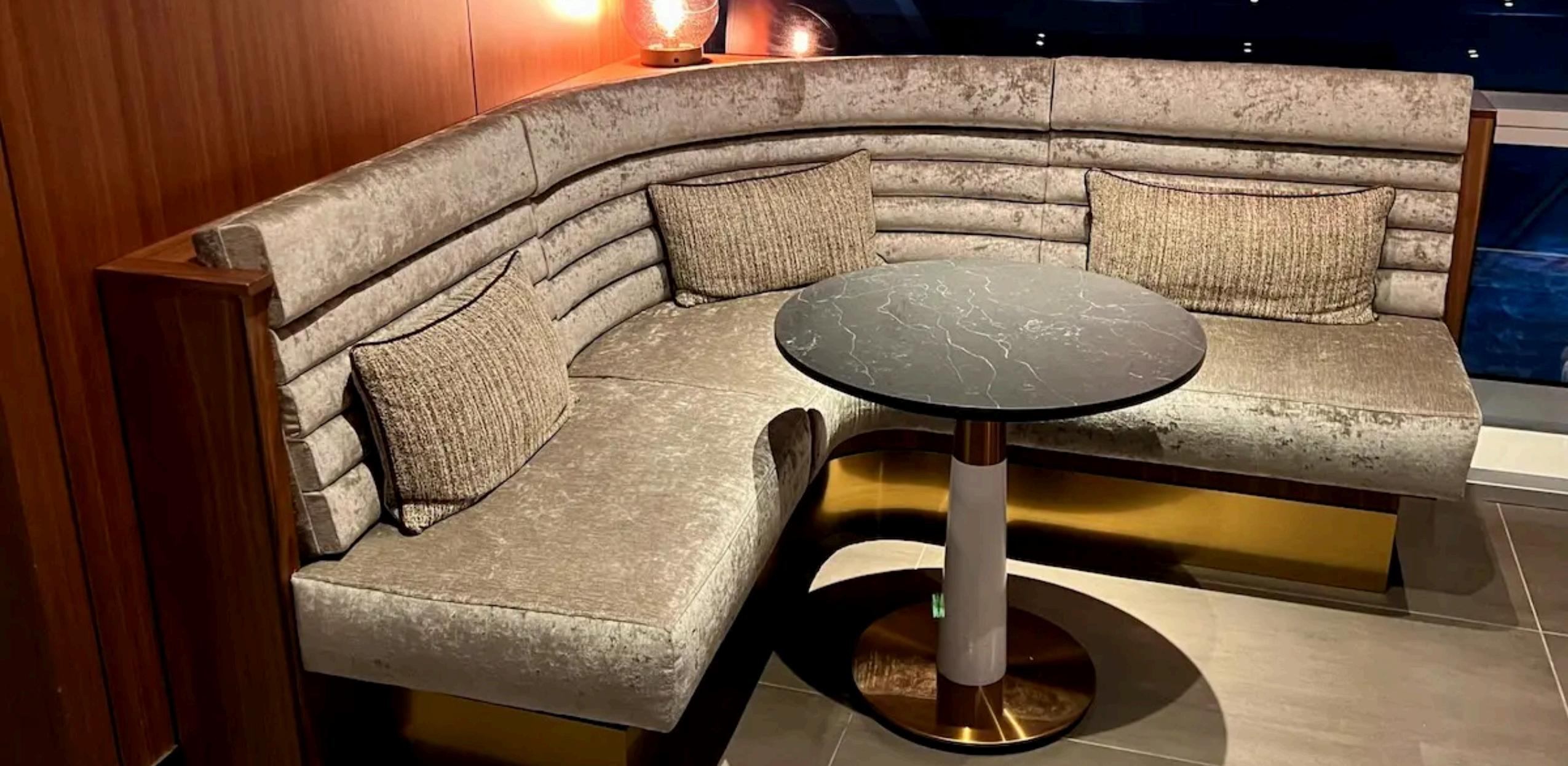 L-shaped wood framed, laminate veneer enclosure, metal corner guards, solid surface cap, stainless steel base, solid surface counter with surface mounted power/usb module. The unit includes a modular corner bench with foam side arm , back rest, polished metal legs.