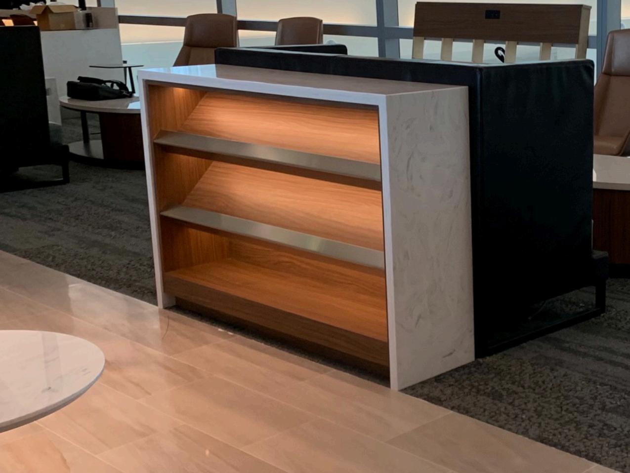 Food service counters and cabinets in wall mounted and island mounted configurations. Each custom unit is designed with accessible plastic laminate clad base cabinets with vented/non-vented door configurations and Delta Sky Club quartz tops. Island units come with quartz side panels.. All recessed food service equipment is coordinated for proper fit and ventilation. Sneeze guard locations are coordinated and factory predrilled for mounting supports.