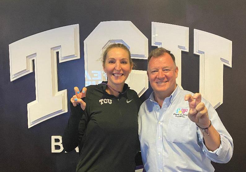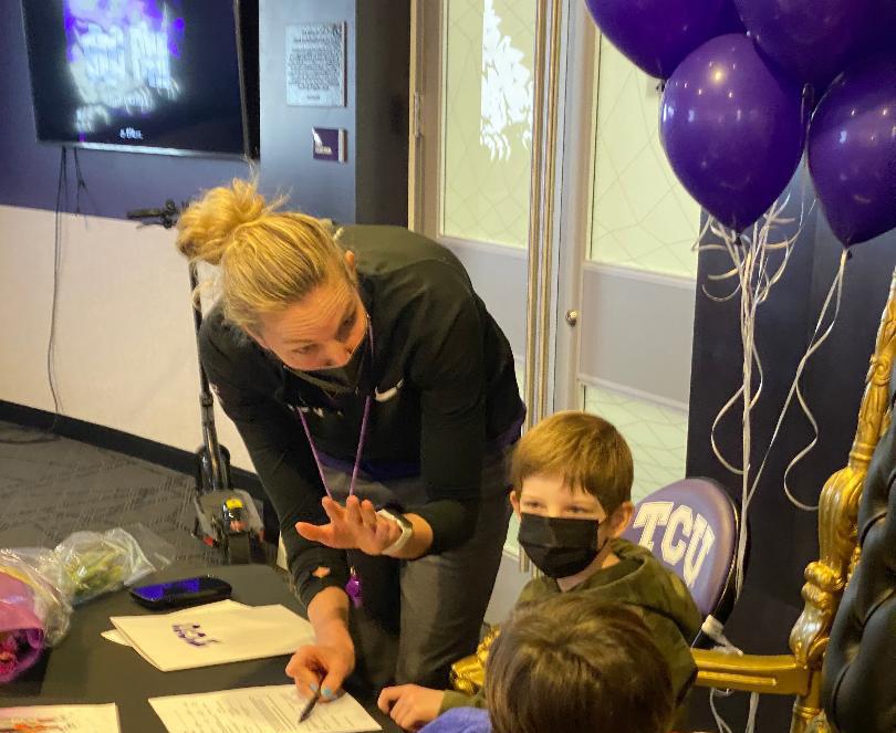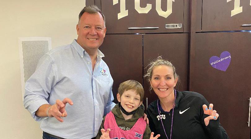Including Ellie, the Horned Frogs newest Friends of Jaclyn adoptee of the TCU women’s basketball team. When it came time to find 11 year old Ellie, who was battling a brain tumor a team in Texas, Raegan and the Horned frogs were all in to embrace her as a member of the women’s Horned Frog basketball team. Raegan has walked in Ellie’s shoes, both know too well the devastating side effects of battling a brain tumor. I have experienced many incredible relationships amongst teams and our FOJ adoptee’s over a decade plus. Raegan and Ellie are the first time in 18 years, I ever had a head coach who experienced a brain tumor and adopted a child with one. “When you have a surgery like this, there’s a lot that goes into it... It’s more than just, ‘Let’s get the tumor out.’ They cut your jaw muscle, they move nerves around and I’m pretty numb from here to here,” Pebley said, pointing from her head to her cheek.