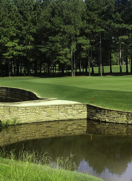 of being at Augusta National. The Champion Bermuda greens are domed with runoffs which will remind you of being in Pinehurst. The par 72 course has six tees with yardages that range from 5,106 – 7,529 yards. To add to the challenge, water comes in to play on eight holes and steep bunkers to make you think about where you need to target your shots.