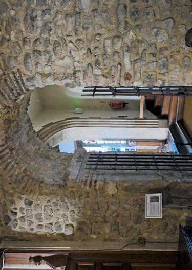 The Roman city wall built in about AD 200 ( left ) and the hypocaust of the Billingsgate baths ( right ), added in about AD 250 to an earlier house
