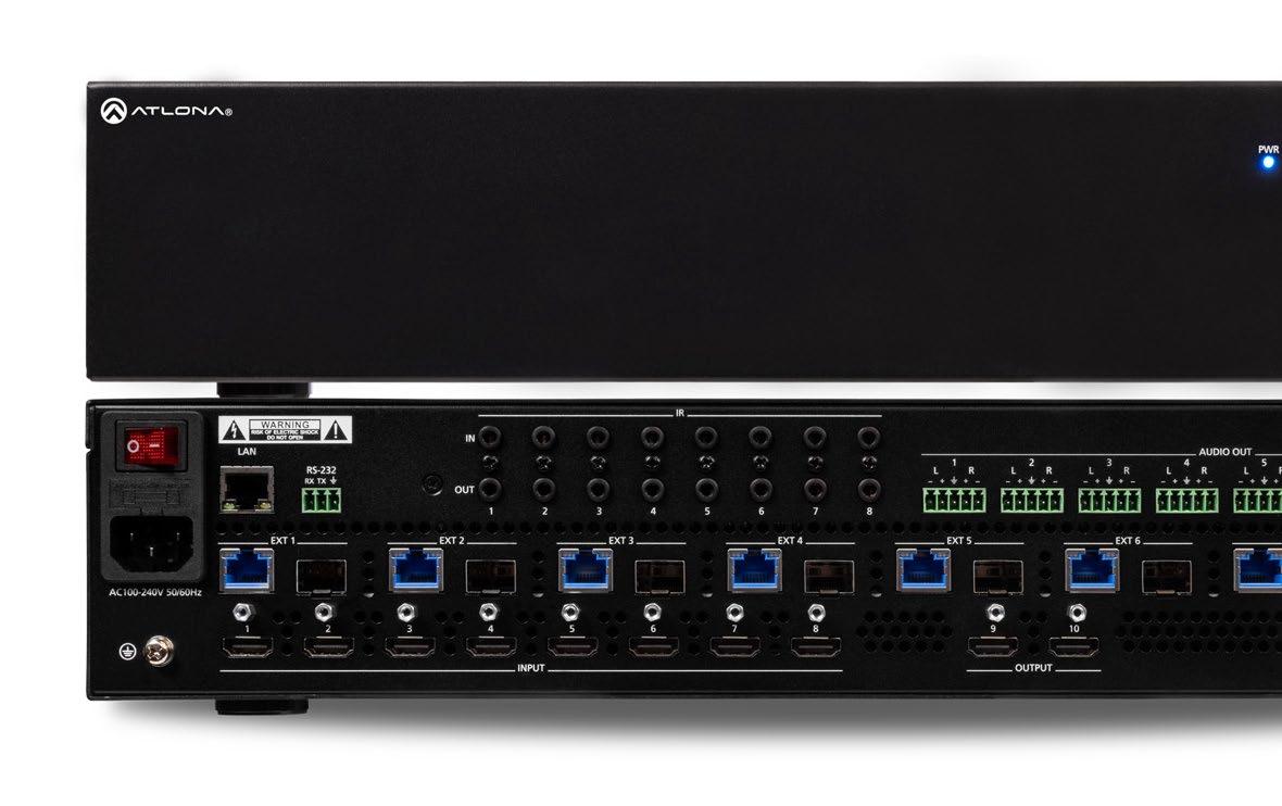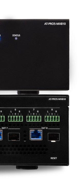 Atlona’s PRO5 Series is anchored by an 8x10 4K HDR matrix switcher that pairs the essential functionality of HDMI-to-HDBaseT switchers with high-performance, pointto-point AV transmission. The AT-PRO5MX810 matrix switcher provides eight HDMI inputs, two HDMI outputs, and eight AV extension outputs with SDVoE technology to extend 4K HDR video using 10GbE connectivity over direct copper or fiber links. All eight extension outputs include an RJ45 port that allows extension up to 330 feet over CAT6A UTP cable along with PoE for powering the receiver, offering the familiarity of HDBaseT technology. Video processing is available in the PRO5-101SC-RX scaling receivers, including 4K video upscaling/downscaling with frame rate conversion.
