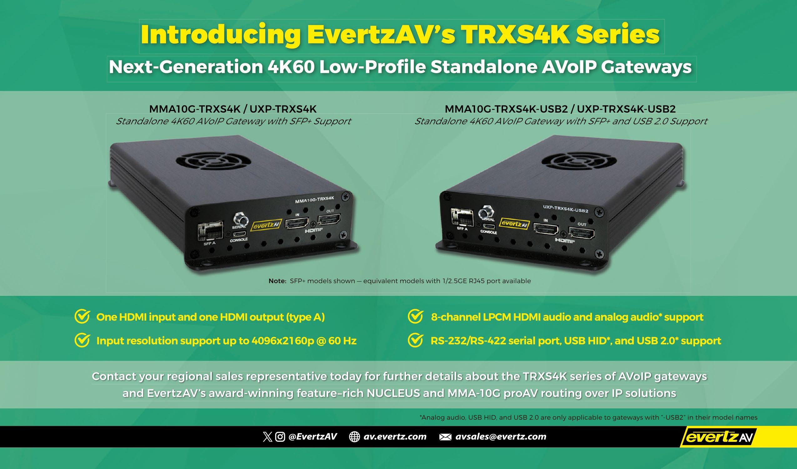 Vanco International’s Evolution EVO-IP 2.0 redefines AV-over-IP distribution with unmatched flexibility, scalability, and ease of deployment. Featuring 4K 4:4:4 video at 60Hz; independently routable KVM, audio, and control signals; and VLAN-free setup, this solution streamlines installation for integrators in a wide range of applications. EVO-IP 2.0 supports Cat6/6A, multimode, and single-mode fiber transmission, making it ideal for SMBs to enterprise environments. Built-in cloud-based management enables remote monitoring and troubleshooting, reducing downtime. With Dante Ready chipsets, eARC/ARC support, and video wall/digital signage capabilities, EVO-IP 2.0 is the ultimate networked AV distribution solution for commercial applications.