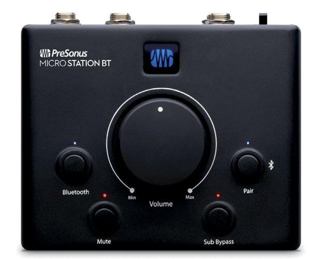 PreSonus has released the new MicroStation BT Bluetooth 5.0 stereo monitor controller, which can receive audio from a phone, tablet or other Bluetooth source and feed it to powered speakers. The MicroStation BT also can be hardwired to a powered subwoofer to create a 2.1 listening environment. A stereo ¹⁄8-inch input is also provided; a Bluetooth On/Off button toggles between Bluetooth and analog sources. Other onboard inputs include balanced left and right ¼-inch TRS inputs, which can route audio from pro-audio hardware to speakers, while the balanced ¼-inch TRS or unbalanced RCA Subwoofer outputs can send audio to a sub. An ¹⁄8-inch stereo headphone/aux output lets users connect headphones or send stereo audio for streaming, recording and more. The main control is a large, ergonomic Volume knob for the overall level of connected speakers and subwoofer. A Sub Bypass button mutes the subwoofer feed, while a main Mute button silences speakers or headphones as needed.