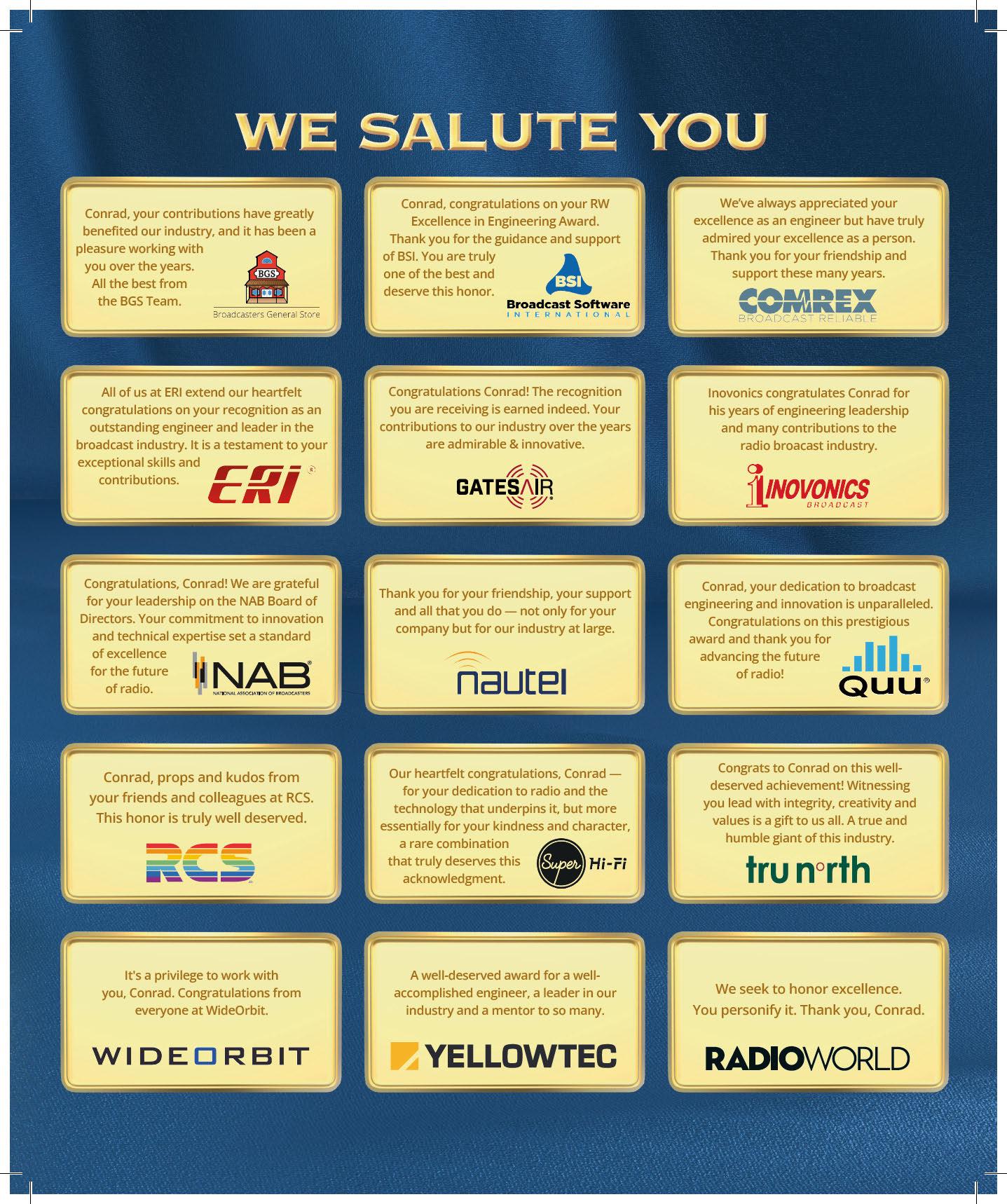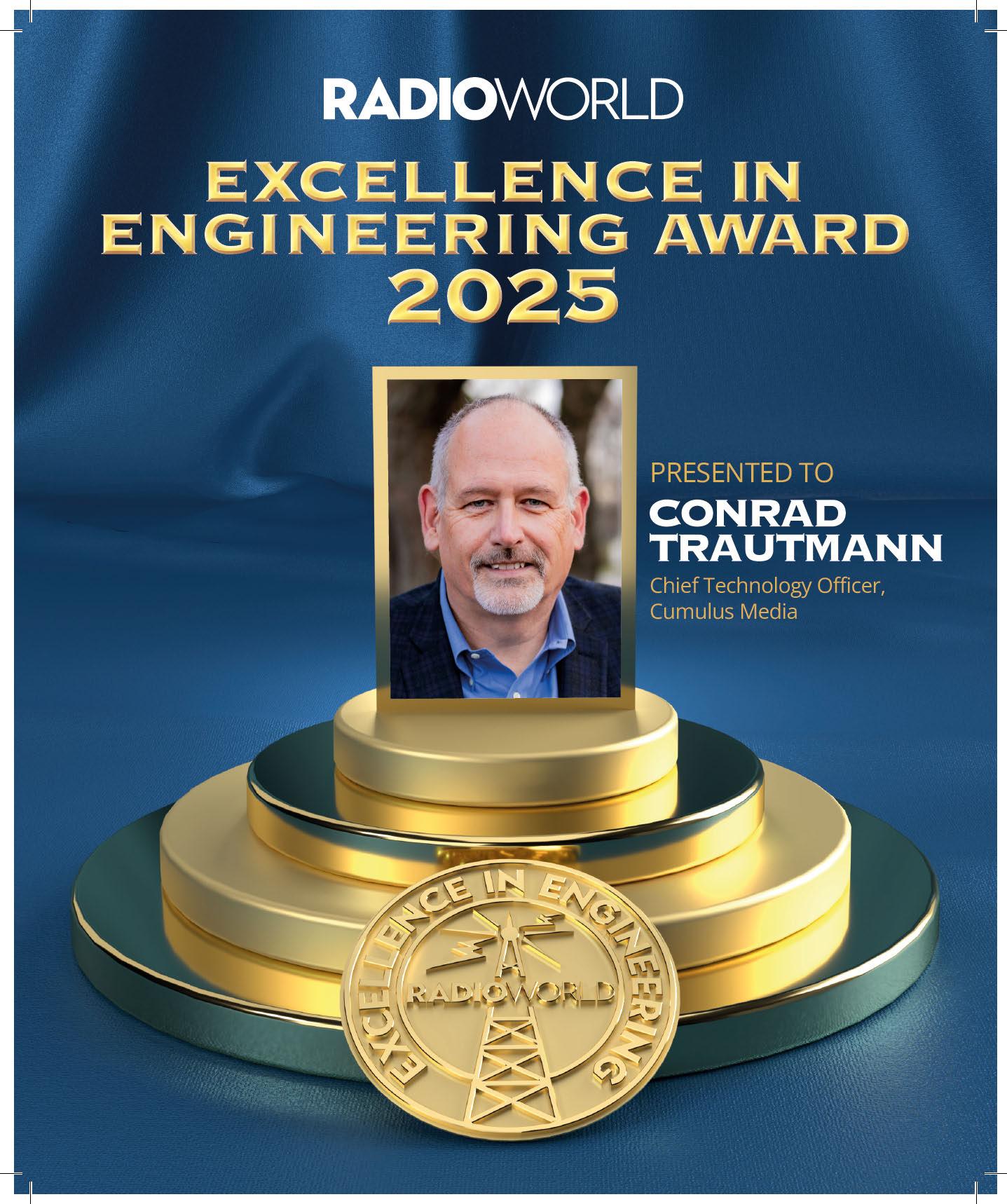 In this issue we celebrate Conrad Trautmann, the 21st recipient of the Radio World Excellence in Engineering Award. If you have worked with Conrad you know how deserving he is of this recognition. Our profile starts on page 5. Meanwhile I also want to share that the fifth recipient of that award, Jeff Littlejohn, retired from iHeartMedia last month.