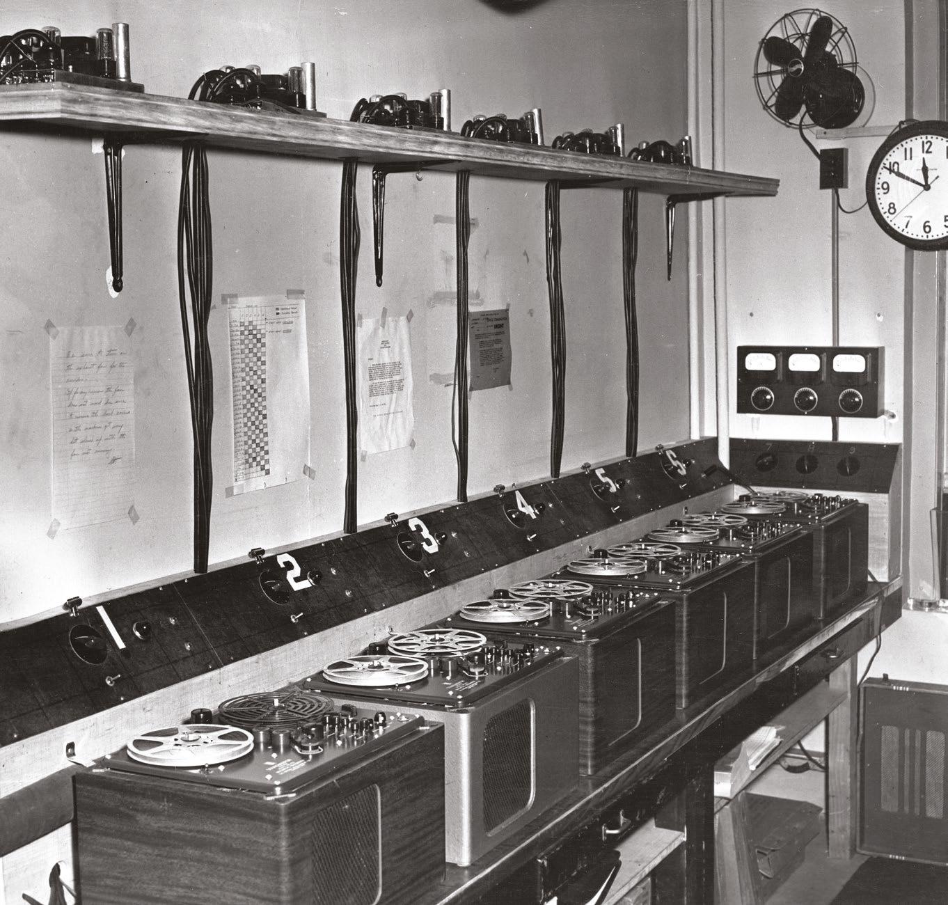 The WTOP engineering staff modified these Brush “Soundmirror” consumer audiotape recorders to withstand the rigors of nearly constant use in delaying network programs in periods of Daylight Saving Time. This photo, probably taken around 1948–49, illustrates how the heat-producing electronics assemblies were removed from the tape transports and relocated to the upper shelf. The fan presumably aided in heat removal. A schedule for recording and playback is on the wall behind the transports.