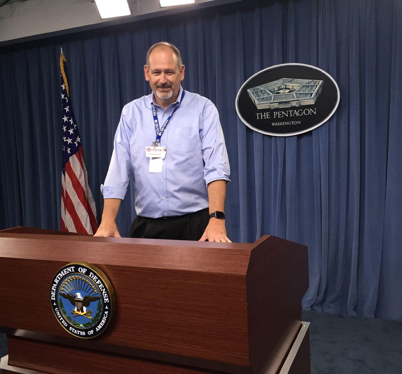 Below Visiting the press briefing area at the Pentagon in 2015.