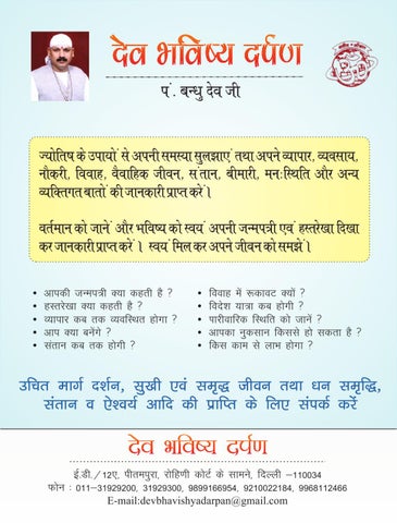nso Hkfo"; niZ.k bZ-Mh-@12,] ihreiqjk] jksfg.kh dksVZ ds lkeus] fnYyh &110034 Qksu % 011&31929200] 31929300] 9899166954] 9210022184] 9968112466 E-mail:devbhavishyadarpan@gmail.com