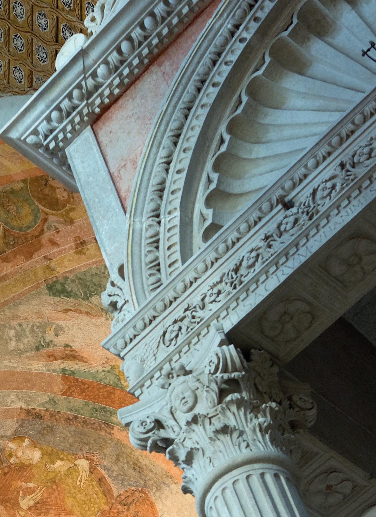 decorano le pareti ma l’emozione più intensa si avverte sollevando lo sguardo verso la luce che penetra dalla finestra e si scorge la bellezza commovente degli angeli cantori che fanno capolino dall’alto, ci occhieggiano giocosi, nel loro cromatismo fatto di tinte chiarissime e fresche che assorbono la luce proveniente dall’esterno amplificandola ad illuminare l’intera cappella. Nell’Oratorio della Purità, adiacente al Duomo, un