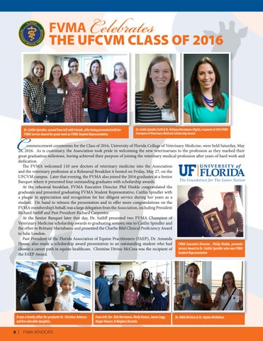 ommencement ceremonies for the Class of 2016, University of Florida College of Veterinary Medicine, were held Saturday, May 28, 2016. As is customary, the Association took pride in welcoming the new veterinarians to the profession as they marked their great graduation milestone, having achieved their purpose of joining the veterinary medical profession after years of hard work and dedication. The FVMA welcomed 110 new doctors of veterinary medicine into the Association and the veterinary profession at a Rehearsal Breakfast it hosted on Friday, May 27, on the UFCVM campus. Later that evening, the FVMA also joined the 2016 graduates at a Senior Banquet where it presented four outstanding graduates with scholarship awards. At the rehearsal breakfast, FVMA Executive Director Phil Hinkle congratulated the graduates and presented graduating FVMA Student Representative, Caitlin Spindler with a plaque in appreciation and recognition for her diligent service during her years as a student. On hand to witness the presentation and to offer more congratulations on the FVMA membership’s behalf, was a large delegation from the Association, including President Richard Sutliff and Past President Richard Carpenter. At the Senior Banquet later that day, Dr. Sutliff presented two FVMA Champion of Veterinary Medicine scholarship awards to graduating seniors; one to Caitlin Spindler and the other to Brittany Martabano; and presented the Charlie Bild Clinical Proficiency Award to Julie London. Past President of the Florida Association of Equine Practitioners (FAEP), Dr. Amanda House, also made a scholarship award presentation to an outstanding student who had FVMA Executive Director , Philip Hinkle, presents chosen a career path in equine healthcare. Christine Divine McCrea was the recipient of Service Award to Dr. Caitlin Spindler who was FVMA Student Representative the FAEP Award.