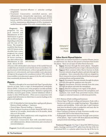 • Ultrasound: Synovial effusion +/- articular cartilage irregularity • Treatment: Conservative: controlled exercise, antiinflammatories, intraarticular injections, and dietary management. Surgical: Arthroscopic debridement of OCD lesions and SCLs, intracystic injections of corticosteroids in SCLs, transosseous debridement of SCLs, treatment of medial femoral condylar SCLs with a transcondylar screw. Prognosis: The prognosis for surgical removal and debridement of OC/ OCD lesions is generally excellent to good depending on the joint and the size of the lesion. The exception Radiograph of would be that horses Distal Radial with OC lesions in the shoulder have a poor Physitis prognosis for soundness, with only 4 of 26 horses starting a Salter Harris Physeal Injuries race after arthroscopic While foals can sustain fractures to a variety of bones, just as debridement in one DIRT OCD Hock an adult horse can, they are also prone to fractures that involve study. About 50-65% the physis. There are six types of Salter Harris fractures. of horses with subchondral cystic lesions of the medial femoral 1. Type1: Fracture through the entire physis. Examples condyle that are treated conservatively return to soundness. Surinclude a femoral head fracture or type 1 olecranon fracture. gical treatment with debridement, arthroscopic guided intracystic 2. Type 2: Most common Salter Harris fracture in foals. injection of corticosteroid, and transcondylar screw placement Fracture extends along the physis and exits through the all improve the prognosis for soundness to about 75%, while the metaphysis. Seen commonly when foals are stepped on. transcondylar screw placement appears to be the only treatment Most common locations include distal third metacarpal/ that consistently decreases the size. metatarsal bone and proximal tibia. 3. Type 3: Uncommon; Fracture extends through the physis Physitis and exits through the epiphysis into the joint. Physitis is thought to be associated with Type V growth plate 4. Type 4: Uncommon; Fracture extends from the joint, injuries in foals, and is a type of developmental orthopedic through the physis and exits the metaphysis. disease (DOD). It may be seen at the periphery (usually medially) 5. Type 5: Physeal crushing at one region of the physis. or in the central part of the growth plate. Related to rapid growth, 6. Type 6: Periosteal bridge between the metaphysis and heredity, excessive grain intake, mineral imbalance which is epiphysis; Can result from periosteal trauma (from similar to other DOD disorders. Often seen in conjunction with surgery or external trauma), or infectious periostitis. angular limb deformities in which there is uneven loading on the physis and epiphysis. • H/S: History of limb swelling and lameness • Clinical Signs: Physeal swelling and lameness; Foals with a • H/S: If identified in foals during their rapid growth phases; fracture are usually non-weight bearing lame. May palpate History of limb swelling +/- lameness crepitus and instability. Foals with type 5 and 6 injuries • Clinical Signs: Physeal swelling +/- lameness may have localized to pain to palpation and may also be • Most Common Locations in Foals: Distal MC/MT3 of the developing an angular limb deformity. fetlock at 3-6 months, distal radius at 8-24 months, distal • Most Common Locations in Foals: Fractures usually occur tibia at 6-18 months at distal MC/MT3 of the fetlock from trauma. • Radiographs: Show radiolucency with irregularity of the • Radiographs: Demonstrate fracture through some portion affected portion of the physis. of the physis. Type 5 and 6 will show physeal remodeling • Treatment: Conservative: Rest with controlled exercise, and periosteal remodeling, respectively. anti-inflammatories, dietary restrictions and correction of mineral imbalance. Treatment/Prognosis: For Type 2 distal MC/MT3 fractures, apply a bandage and dorsal PVC splint from the tip of the toe Prognosis: Good with conservative treatment. to proximal MC3, or a plantar splint from the tip of the toe to 10 The Practitioner