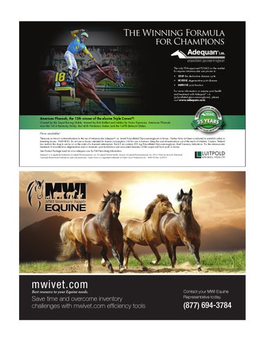 Now available! There are no known contraindications to the use of intramuscular Adequan® i.m. brand Polysulfated Glycosaminoglycan in horses. Studies have not been conducted to establish safety in breeding horses. WARNING: Do not use in horses intended for human consumption. Not for use in humans. Keep this and all medications out of the reach of children. Caution: Federal law restricts this drug to use by or on the order of a licensed veterinarian. Each 5 mL contains 500 mg Polysulfated Glycosaminoglycan. Brief Summary Indications: For the intramuscular treatment of non-infectious degenerative and/or traumatic joint dysfunction and associated lameness of the carpal and hock joints in horses. See Product Package Insert at www.adequan.com for Full Prescribing Information Adequan® is a registered trademark of Luitpold Pharmaceuticals, Inc. © Luitpold Animal Health, division of Luitpold Pharmaceuticals, Inc. 2015. Photo by Anne M. Eberhardt, Copyright Blood-Horse Publications used with permission. Triple Crown is a registered trademark of Triple Crown Productions LLC. AHD132 Rev. 6/2015
