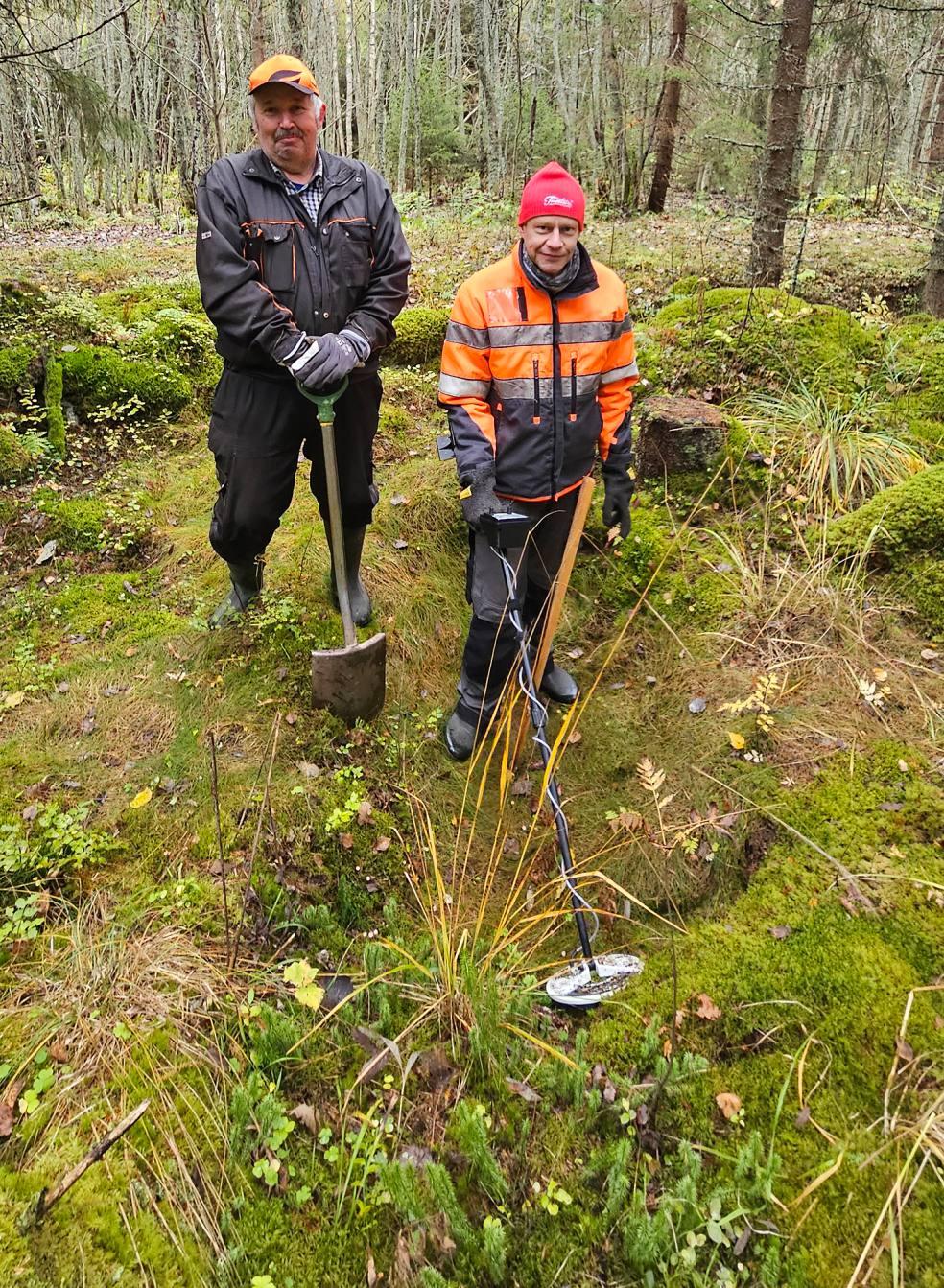 Pommin sirpaleiden etsintää ”miinaharavan” avulla. Kuvassa vasemmalta Hannu Smolander ja Osmo Puurunen. Kuva: MikaNissinen.