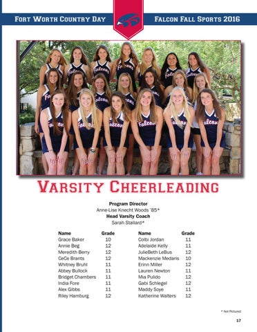 Varsity Cheerleading Program Director Anne-Lise Knecht Woods ’85* Head Varsity Coach Sarah Stallard* Name Grade Grace Baker 10 Annie Beg 12 Meredith Berry 12 CeCe Brants 12 Whitney Bruhl 11 Abbey Bullock 11 Bridget Chambers 11 India Fore 11 Alex Gibbs 11 Riley Hamburg 12