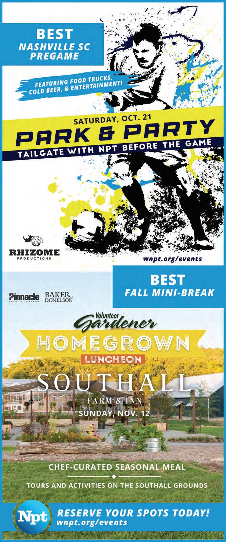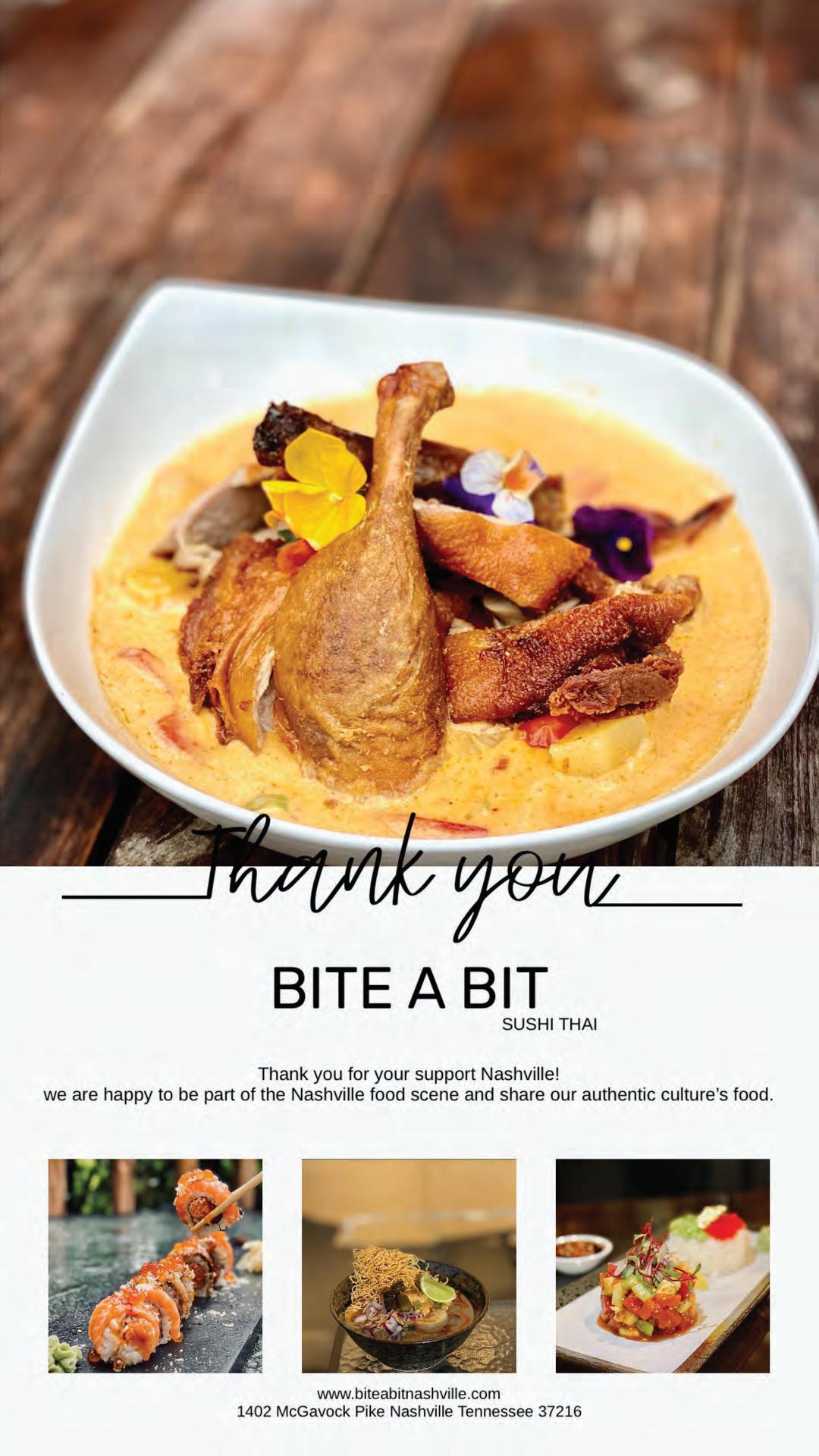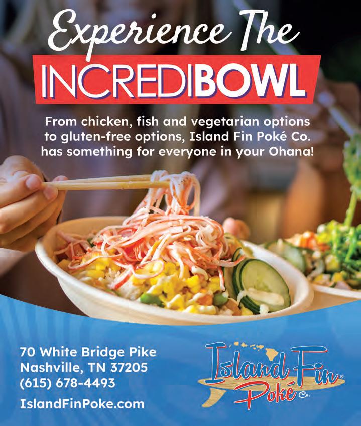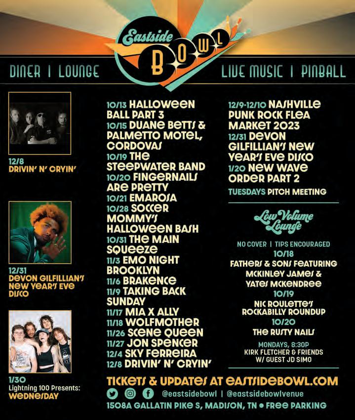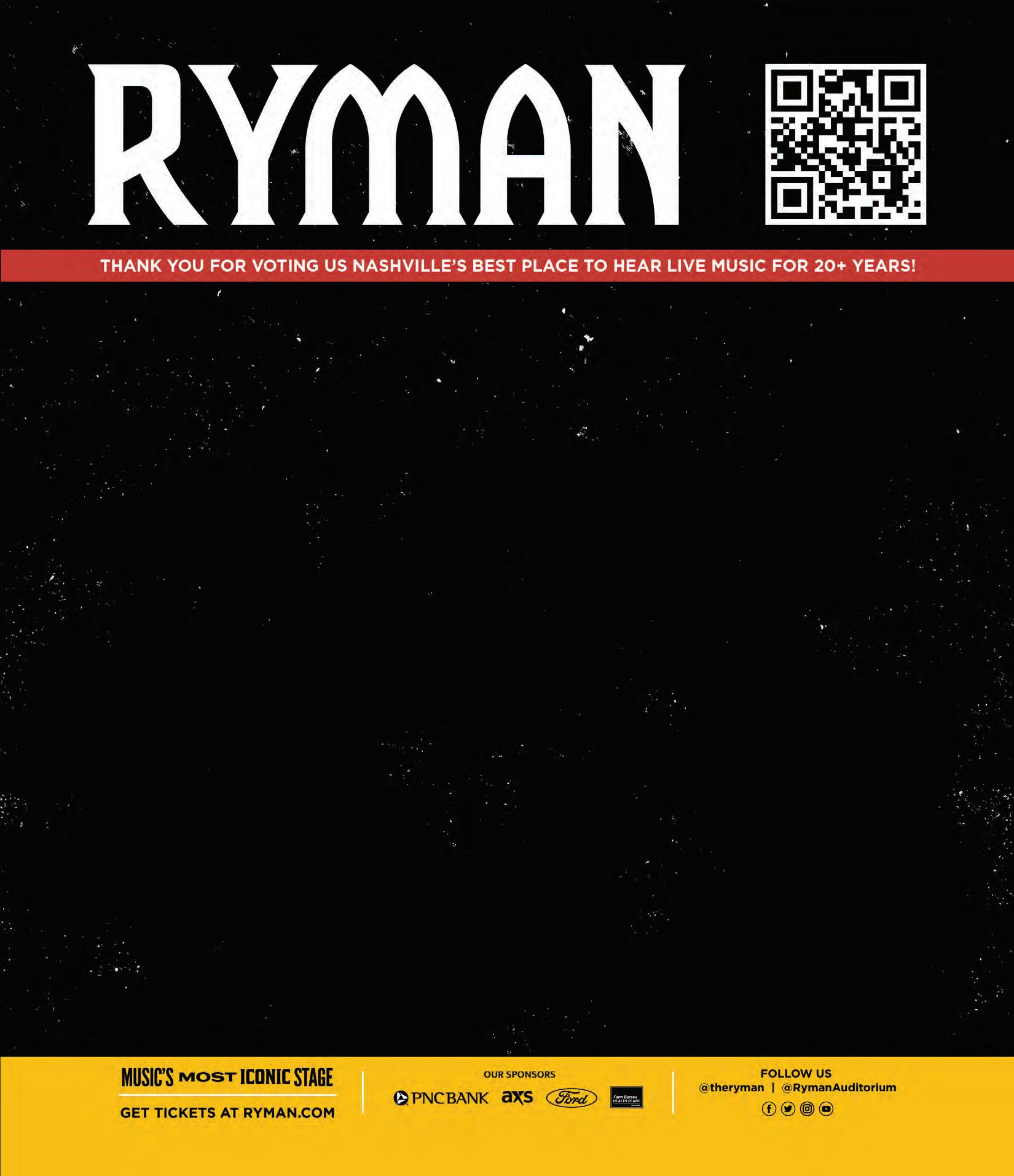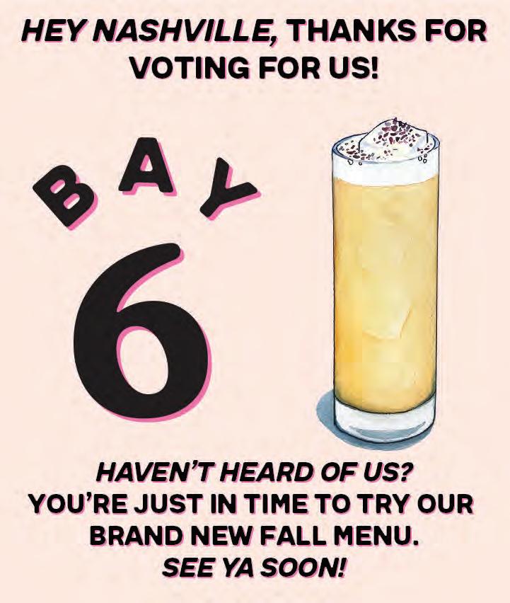 NASHVILLE SCENE • OCTOBER 12 – OCTOBER 25, 2023 • nashvillescene.com 5 MEZZANINE PATIO OVERLOOKING FIRST HORIZON PARK TICKETS • BOWLING RESERVATIONS • BOX SEATING • SPECIAL EVENTS EAT. DRINK. ROCK. AND ROLL. AMAZING STAGE 19 BOWLING LANES 4 BARS 1,200 CAPACITY 1 FOOD BY GO TO BROOKLYNBOWL.COM OR SCAN THE QR CODE “ 1/2 PRICED FAMILY BOWL & BRUNCH • SATURDAYS FROM 11AM-3PM