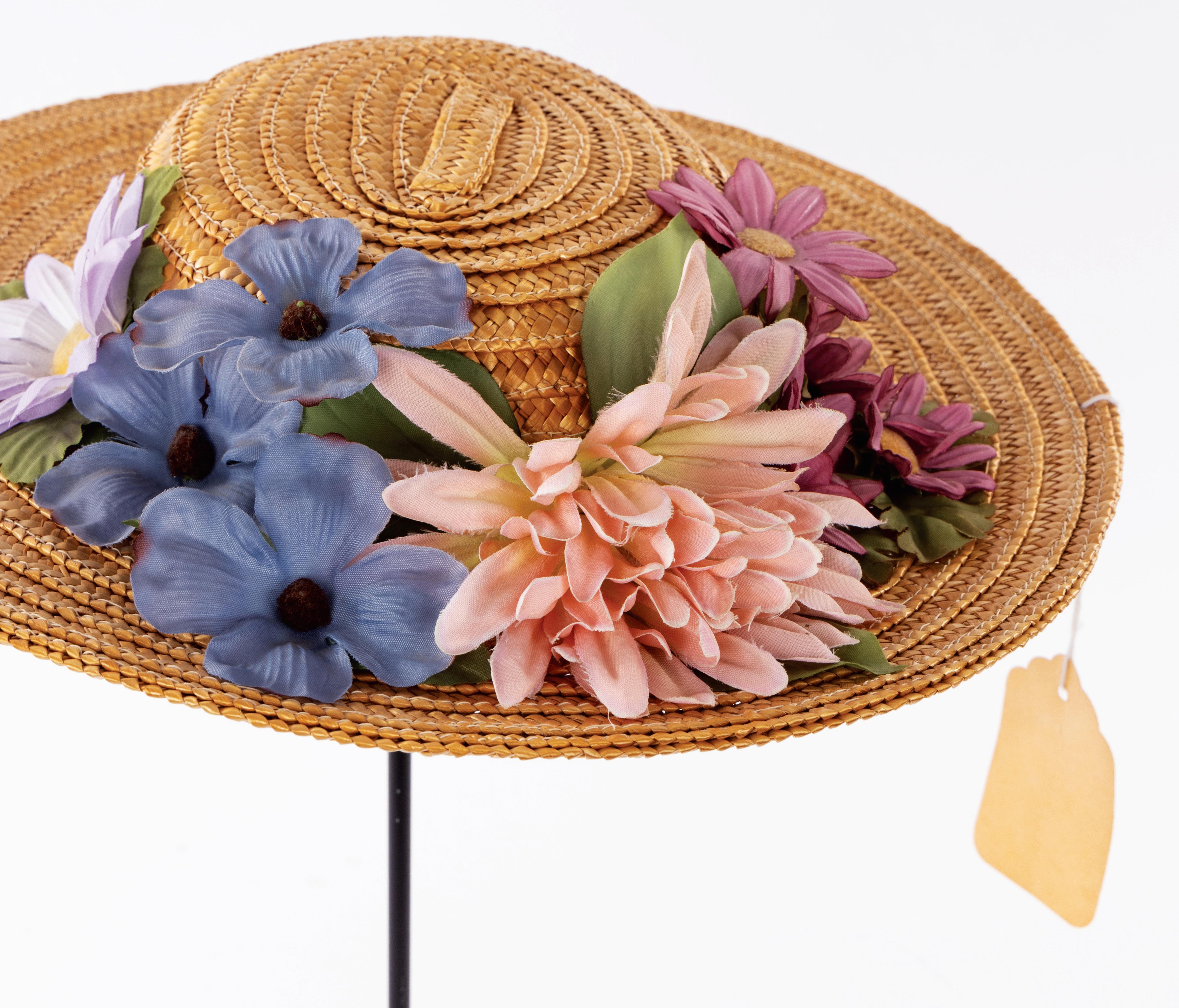 This straw hat, decorated with cloth flowers and dangling $1.98 price tag, was worn by Minnie Pearl for her Grand Ole Opry debut, November 30, 1940— and for ten years of Saturday night performances on the show with Rod Brasfield.