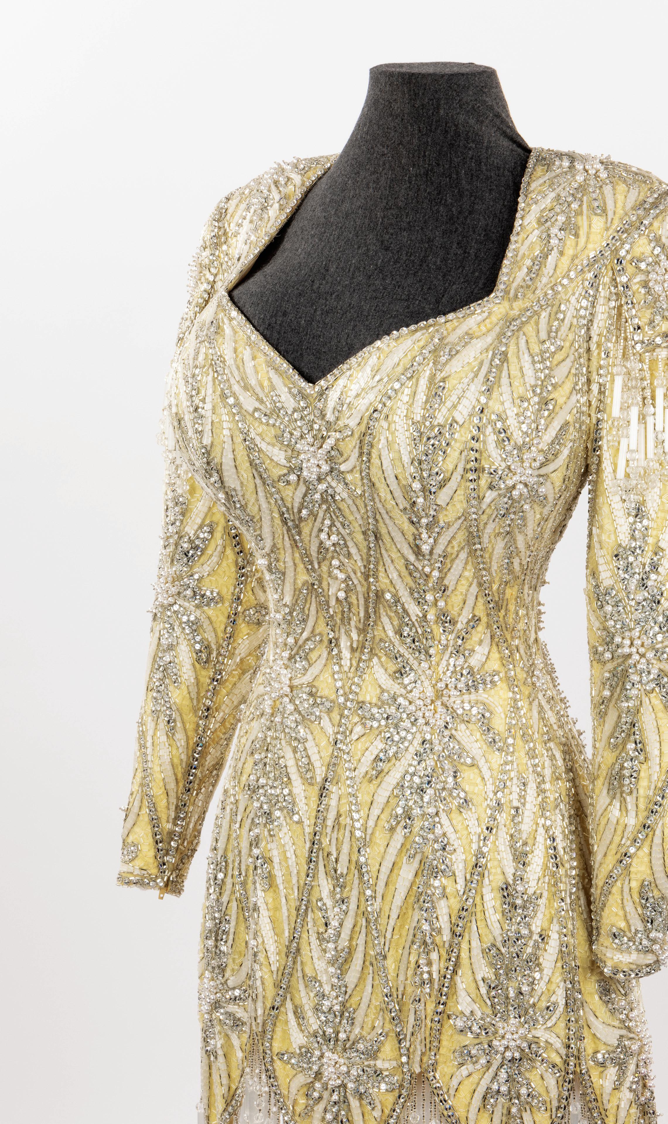 This Tony Chase–designed dress, embellished with rhinestones, sequins, and pearl beads, was worn by Dolly Parton at the 1993 CMA Awards, where she accepted the association’s inaugural Country Music Honors Award.
