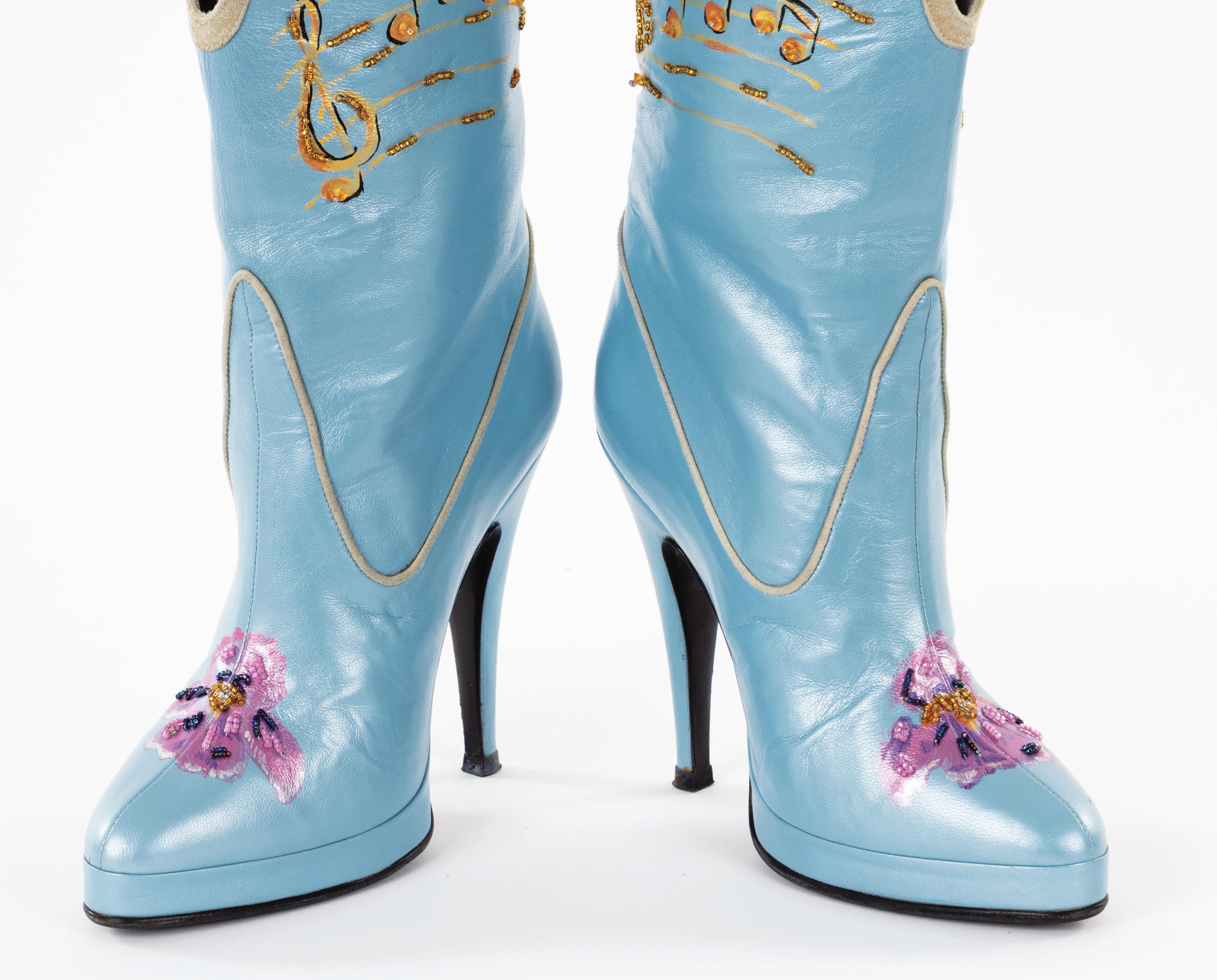 These baby blue boots, hand-painted and beaded by costume designer Bambi Breakstone, were worn by Dolly Parton at the 2002 photoshoot for her album Halos & Horns, shot by portrait photographer Annie Leibovitz.