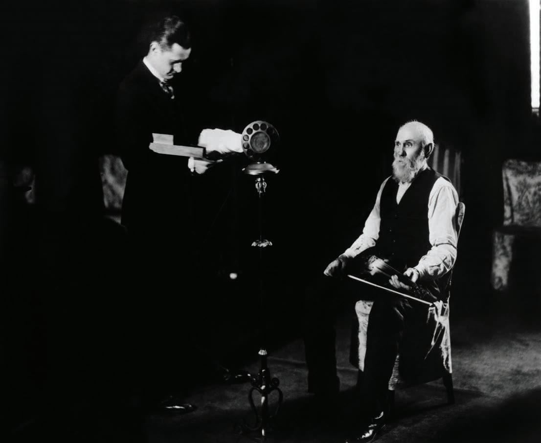 ON NOV. 28, 1925, WSM-AM radio announcer George D. Hay (standing at microphone) hosted the first WSM Barn Dance. Broadcast from a small studio in the Nashville offices of the National Life and Accident Insurance Company, the live radio show featured traditional country music by performers such as George’s inaugural guest, 77-year-old fiddle player Uncle Jimmy Thompson (seated). The program adopted the name Grand Ole Opry in 1927 and eventually relocated to the Ryman Auditorium. In 1974, the show moved to the Grand Ole Opry House on Opryland’s campus, where it began regular television broadcasts in 1985 — and now embarks on a new era of country music.