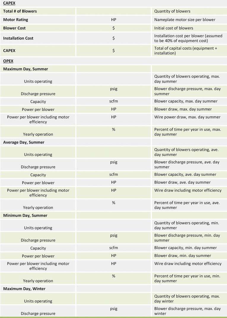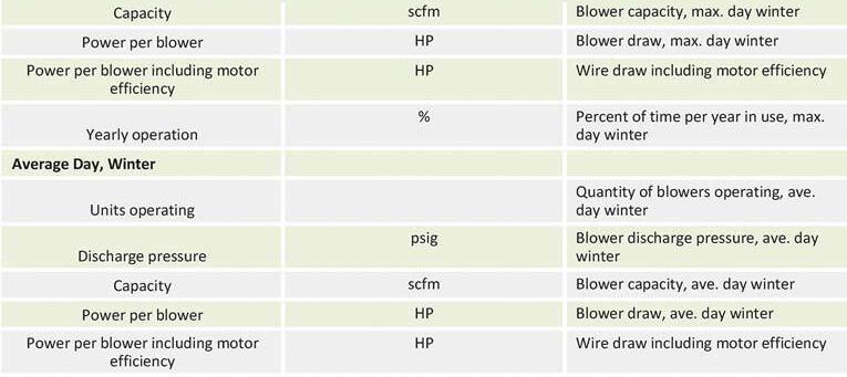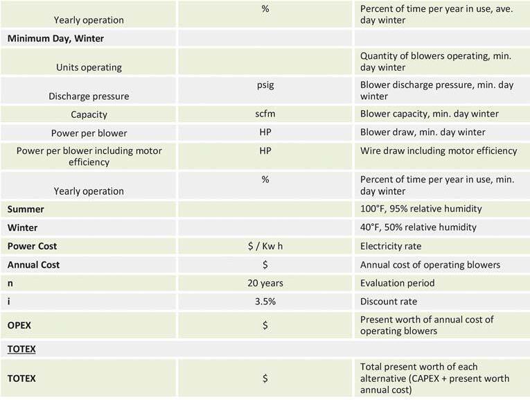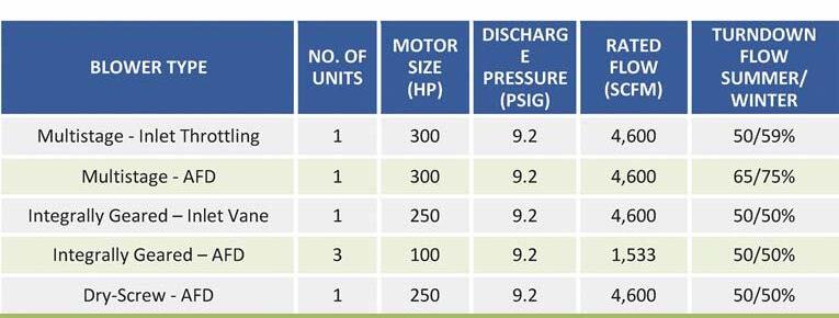 The blowers were evaluated at a discharge pressure of 9.2 pounds per sq in. gauge (psig) and a suction pressure loss between 0.3-0.4 psi (from dirty inlet filters and inlet piping). Any variation in discharge pressure should have a relative impact on rankings of the alternatives.